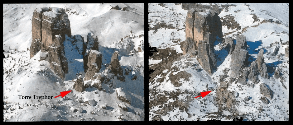 Den ikoniska klippgruppen Cinque Torri vid Cortina d'Ampezzo består egentligen av 11 "torn" av olika storlek, där det tolfte "tornet" Trephor föll samman 2014, se nedan (bilder före och efter från nätet med helt annan vinkel än min bild). Rodret till PC!