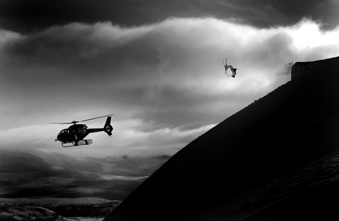 Morgonljuset lade sig vackert som en slöja över de norrländska fjällen. I horisonten hördes ett dovt ljud från helikoptern då dess propellrar bröt luften ovanför den. Piloten lät sin helikopter hänga över bergskrönet, samtidigt som filmaren bakom honom förevigade skidåkarna då de glänsande hoppade med sina stilfulla akrobatkonster.