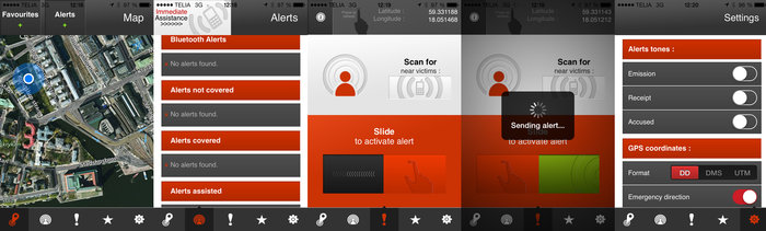 Appen har fem “flikar” där den mittersta, som autostartar, bara har två funktioner – söka efter offer samt sända hjälpsignal. Övriga flikar är, från vänster till höger, Karta (GPS), Alerts, Prenumeration (den är inte gratis) och Inställningar.