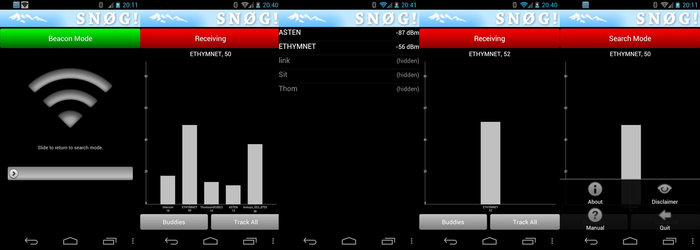 Signalerna visas som staplar på displayen, ju högre stapel desto starkare signal, och som extra hjälp finns det även ljud. Appen är inte alls olik en gammal, enantennig transceiver, vilket också kan förklara varför vi överlag uppfattade den som rätt lättanvänd – av de tre apparna i testet var Snøg mest lik något vi använt förut.