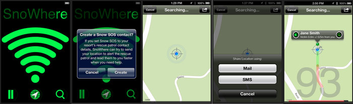 SnoWhere sänder ut en signal som kan plockas upp av andra användare av appen inom en radie av 40 meter. Den fungerar utan täckning och vill helst att man stänger av WiFi:n för bästa effekt. Själva designen är väldigt enkel med en av och på-knapp, en kart-knapp och en sök-knapp. Klickar man på sök-knappen kommer även där upp en karta av Google Maps-typ.