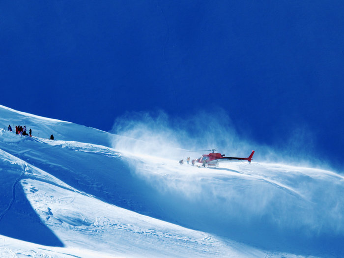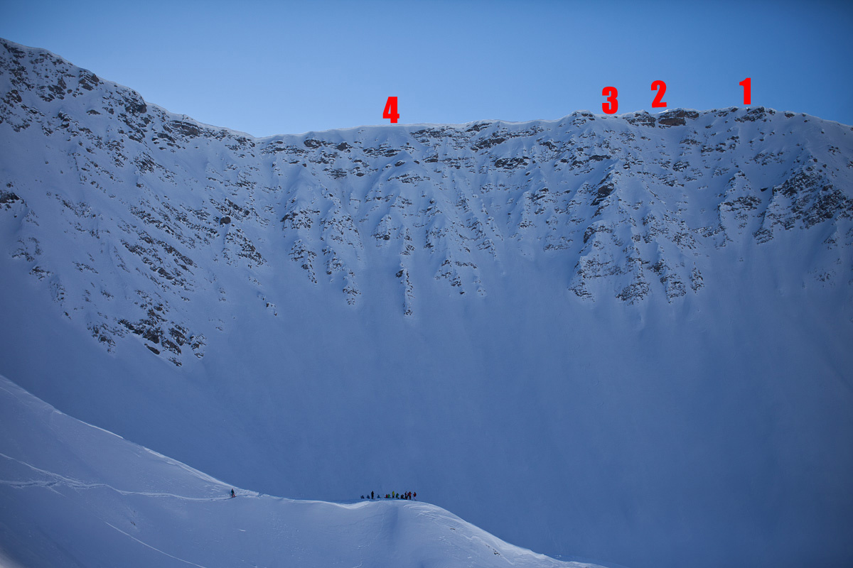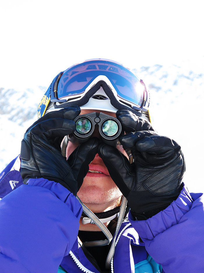 Sen dyker helikoptern upp och gör några häftiga manöver inför de många kameralinser som spanar på facet. Både TV och dagstidningar från hela Europa är här. Jag hänger mest med Niklas, en snowboardåkare från Frankfurter Allgemeine Zeitung och självklart med Nacho från Trofeo Nieve, Spaniens skidmagasin med stort S. Helikoptern lämnar tre föråkare på toppen tillsammans med en bergsguide. Åkarna droppar in en efter en från de olika drop points som är utsatta.