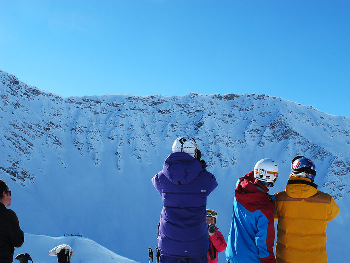 Det är förvånande vilken god stämning det finns åkarna emellan. Alla delar tips till varandra, diskuterar alternativ, skämtar. Killar och tjejer bollar idéer till linjer och dropp, analyserar möjligheter och funderar tillsammans om hur snön ser ut på olika delar av facet.