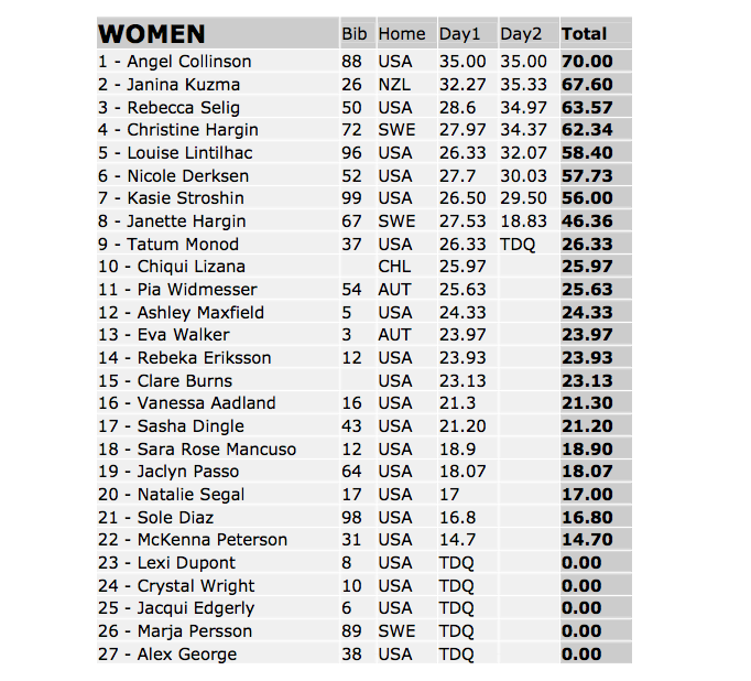 Det blev istället Angel Collinson som vann stoppet efter två bra åk. Janina Kuzma och Rebecca Selig gjorde Collinson sällskap på podiumet.
