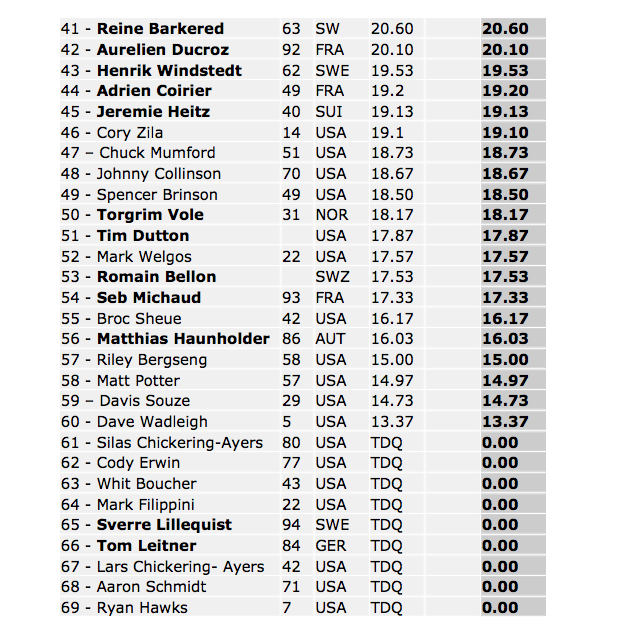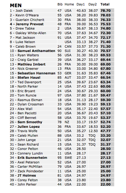 Kevin O’Meara tog andraplatsen strax före Guerlain Chicherit, som är tillbaka på tävlingsscenen efter ett par års uppehåll. Bästa svensk blev Rasmus Ekman som slutade 21:a. Jeremy Prevost blev bäste Freeride World Tour-åkare och tar därmed också över totalledningen från Henrik Windstedt.