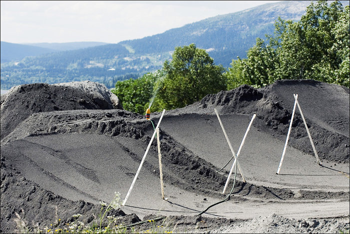 Vädret har varit strålande i flera veckor och många cyklister har kommit till Åre för att cykla. Det är så torrt i markerna på Åreskutan att det faktiskt har blivit svårt för de som bygger att få anordningarna att sätta sig ordentligt. Främst det som byggs i jord och sand. Dirthoppen, i Fox Slope Style linjen, tvingas Skistar att vattna för att de ska binda ihop.