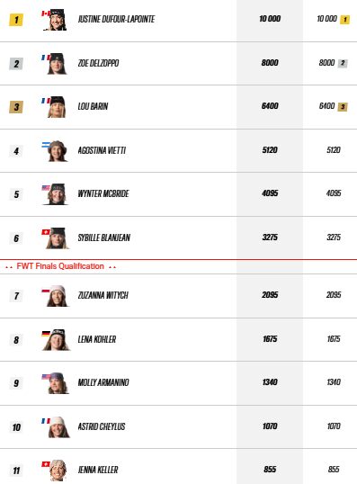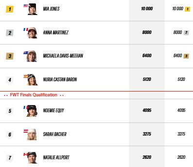 Bakom henne klev två franska rookies upp på pallen: Zoé Delzoppo och Lou Barin. Delzoppo höll ihop en stabil och ren linje, medan Barin öppnade sin FWT-karriär med en snygg 360 och visade tydligt att hon kommer från freestylevärlden.