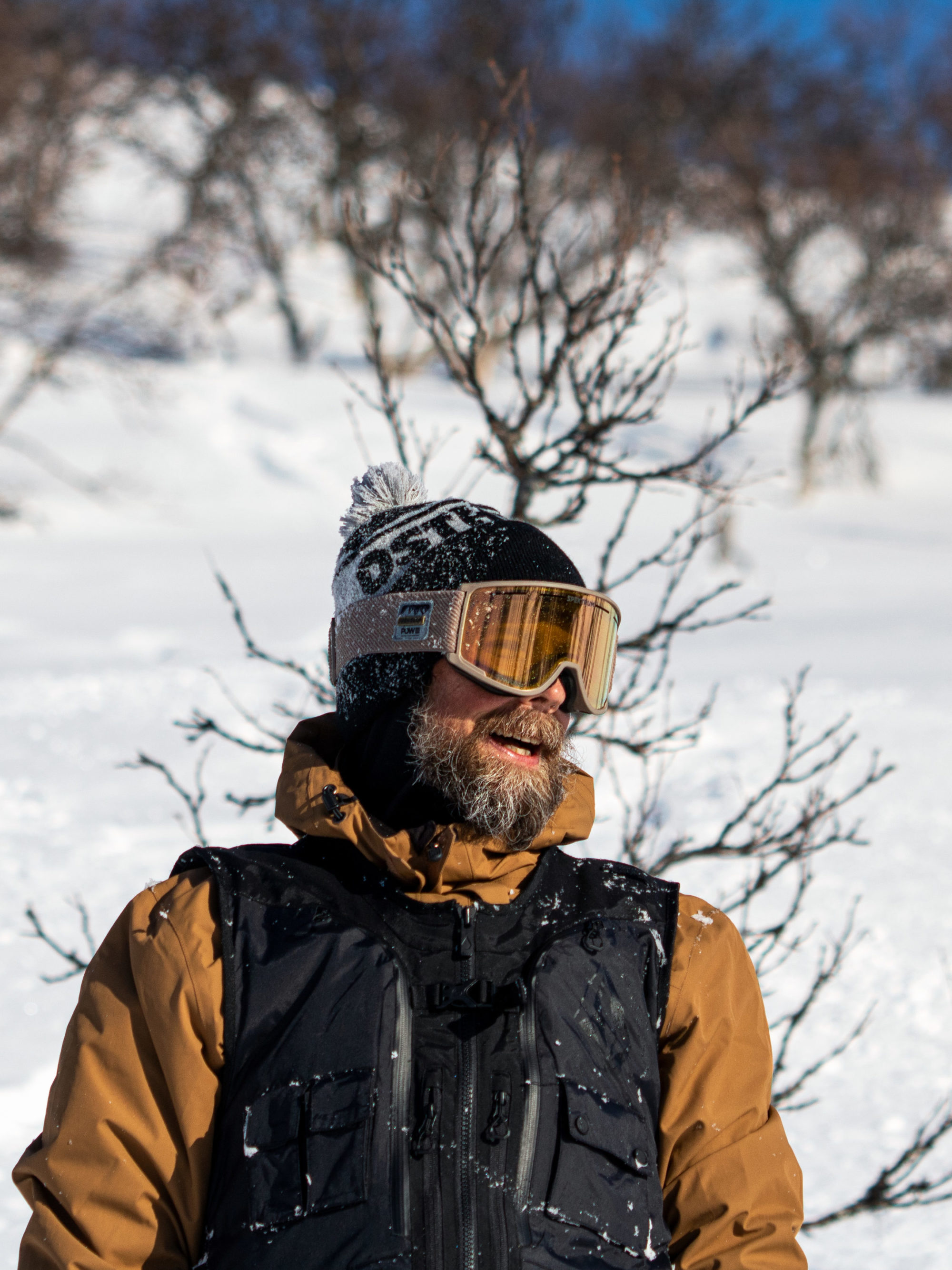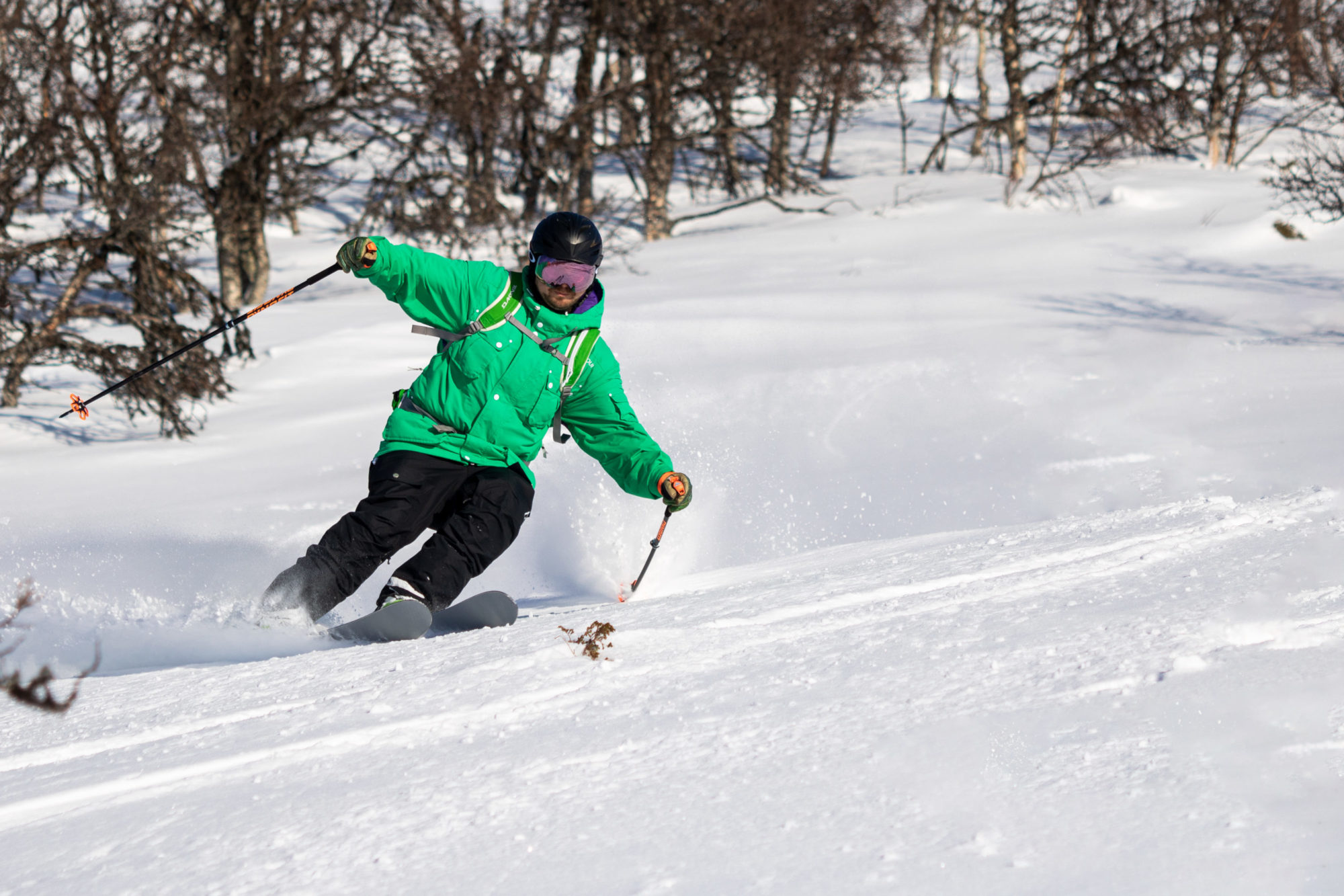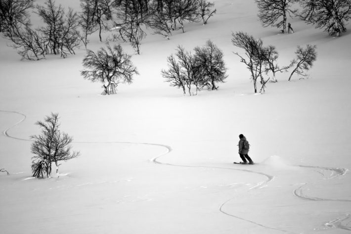 Men sedan vänder vinden och vi får det vi kom för… puder. Eller, jag ska inte överdriva. Snön är inte jättefluffig då senaste dagarnas varma temperaturer uppenbarligen nått upp till Stora Ramundberget också. Men den är tillräckligt mjuk för att för att det ska vara fullt njutbart. Skogen är dessutom sådär perfekt gles som den nästan aldrig är och det finns inte ett enda spår i snön. Fram tills nu.