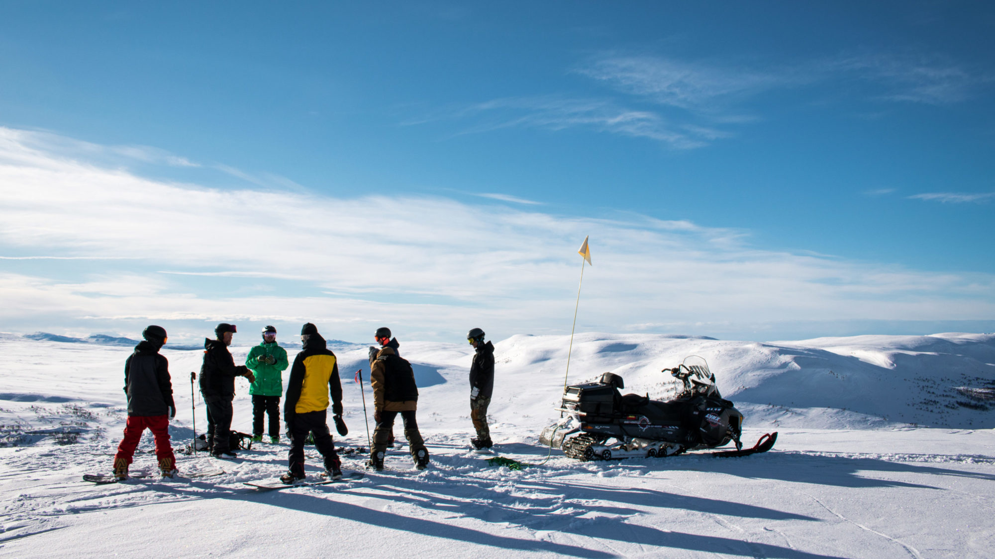 Vi åker uppskattningsvis tio minuter på flacken innan vi kommer fram till en fjällsida som är tillräckligt brant för att skotern inte ska orka tolka hela gruppen upp. Så vi delar upp oss på hälften och beger oss upp mot toppen i tur och ordning. Vägen upp tar inte mer än en minut, för egen maskin hade samma sträcka säkert tagit en timme inkluderat fix men bindningar och stighudar.