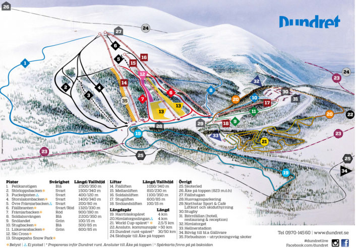 Dundret ligger en mil sydväst om Gällivare, fallhöjden är 350 meter. Toppen ligger på 823 meter över havet och man har 15 pister och 4 pister. Mer om skidorten i skidortsdatabasen.
