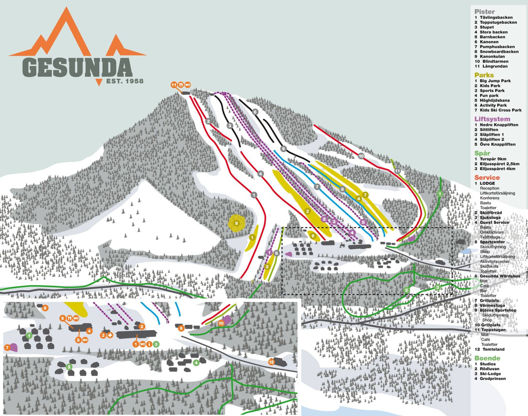 Gesundaberget ligger mellan Mora och Leksand, vid sjön Siljan i Dalarna. Fallhöjden är 270 meter och lutningen är väldigt uppskattad av medel och duktiga skidåkare, då man kan åka svart och röd pist som är ihållande bra från topp till botten.