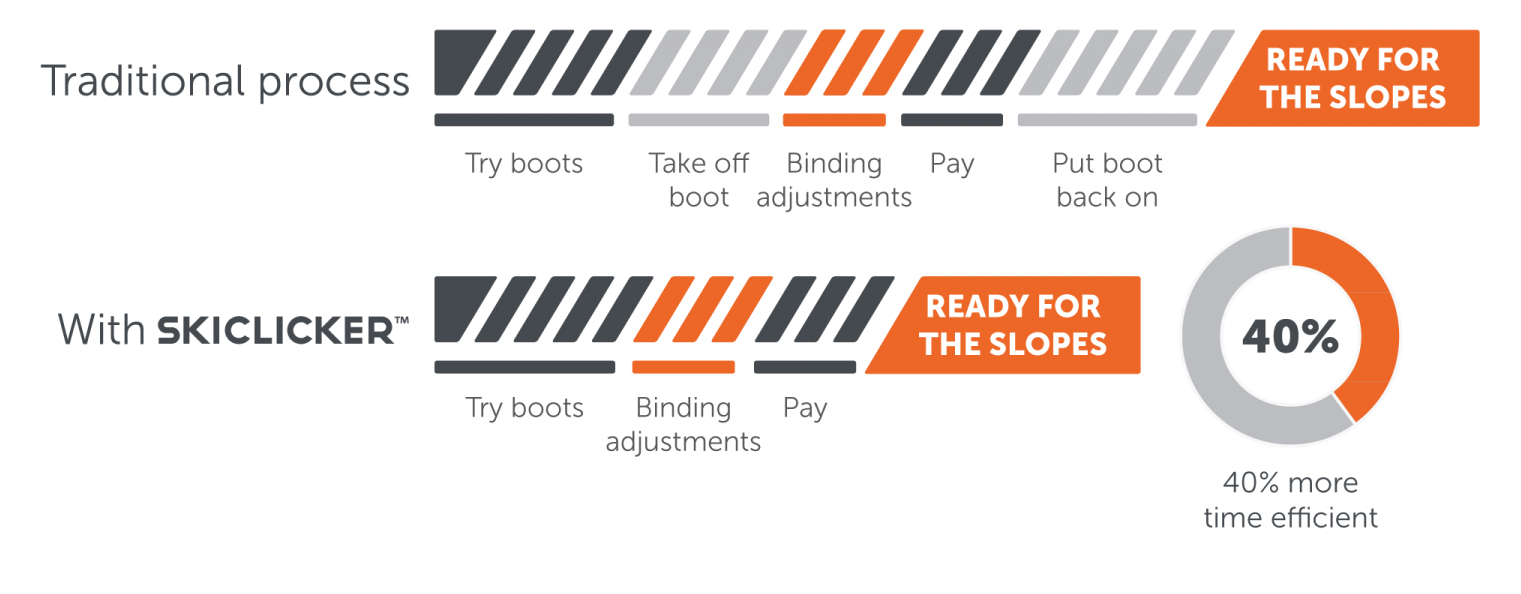 Och faktum är, att detta är guld värt för skiduthyrningar, både för personalens axlar och för bankkontot. Uthyrningen mäter pjäxorna med SkiClicker Boot Analyzer, därefter lagras informationen i en databas och när sedan pjäxan som ska hyras ut scannas så kan personalen använda attrappen SkiClicker Sole, istället för pjäxan, för att justera och ställa in kundernas skidor. Därmed slipper gästen ta av sig pjäxan som de precis har fått på sig och kommer snabbare ut i backen, vilket också innebär mindre svettig tid i uthyrningen. Hela 40 procent snabbare ska förloppet att hyra skidutrustning gå, enligt företaget själv.
