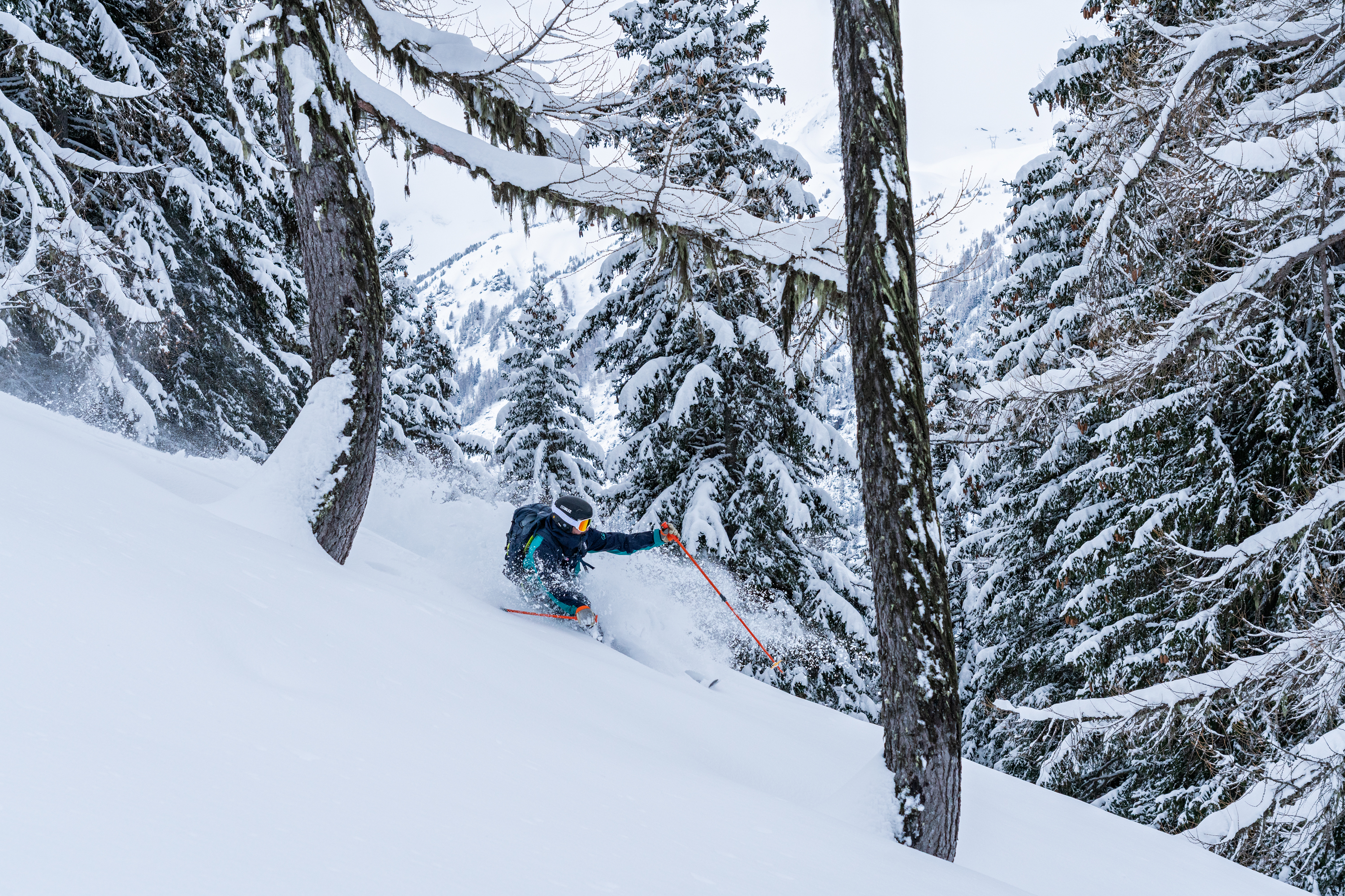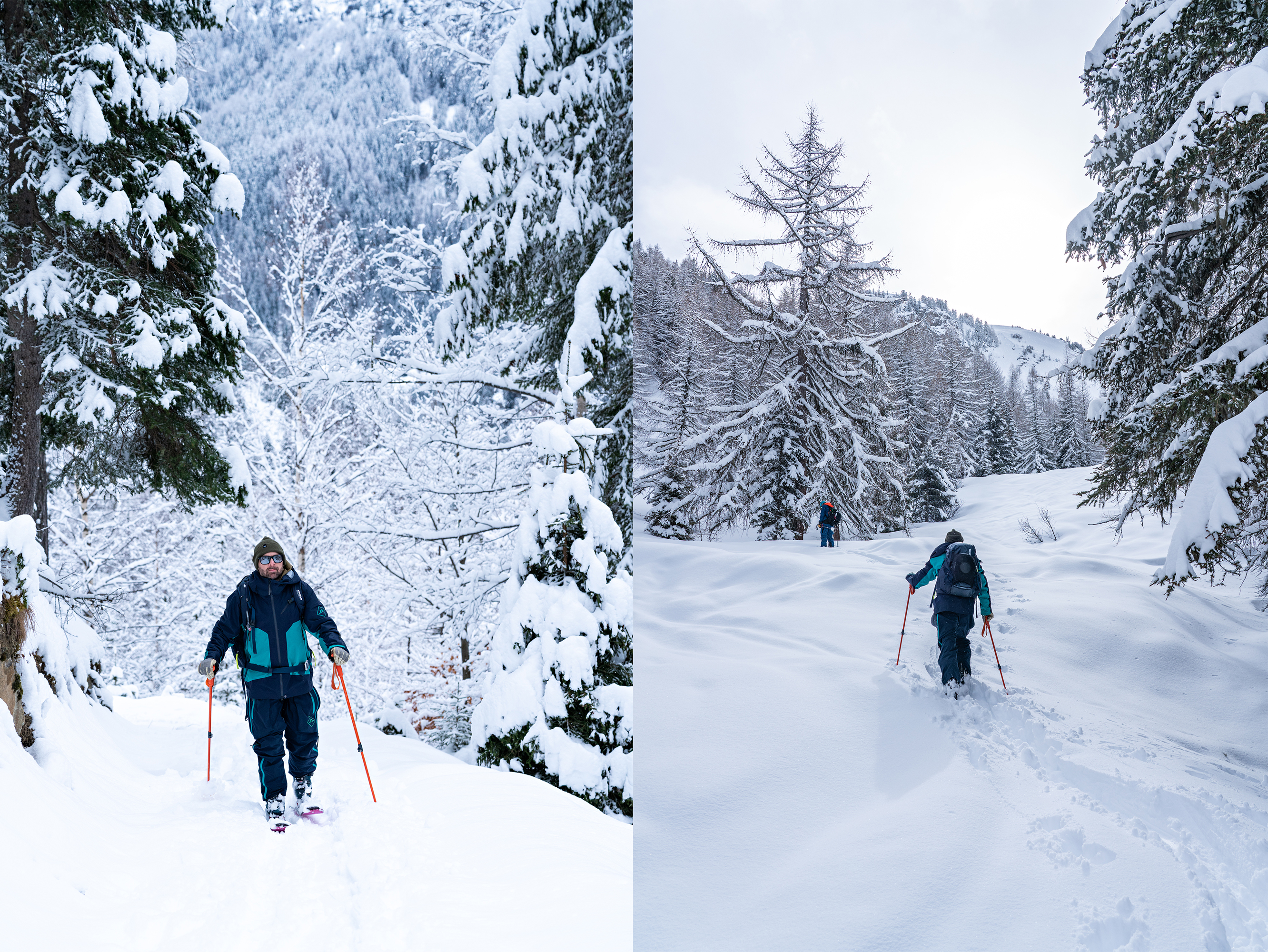 Efter vi har passerat genom små tunnlar av sten och snirklat oss upp på andra sidan dalen parkerar vi på en liten grusväg. I gläntan framför oss ligger ett handfull små alphus i stilenligt varmbrunt timmer i sluttningarna. Snön är blandat isig och blöt av vatten. Vi klickar i gåläge på hybridpjäxorna, spänner på stighudarna och tar av oss de första lagren kläder. Först följer vi mer eller mindre upptrampade stigar, där fotspår och skoterspår varvas om vartannat. De vackra träden är tunga med snö. Men inte för att det har dumpat, utan för att snön är tung och vattnig. Mitt ständiga resesällskap, Andreas Lundstam, tittar oroligt på mig med en menande snö-kvalité-blick. Jag, 30 meter efter, tittar oroligt tillbaka – kommer min undermåliga försäsongsträning hålla?
