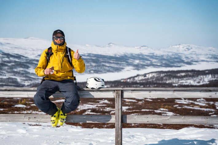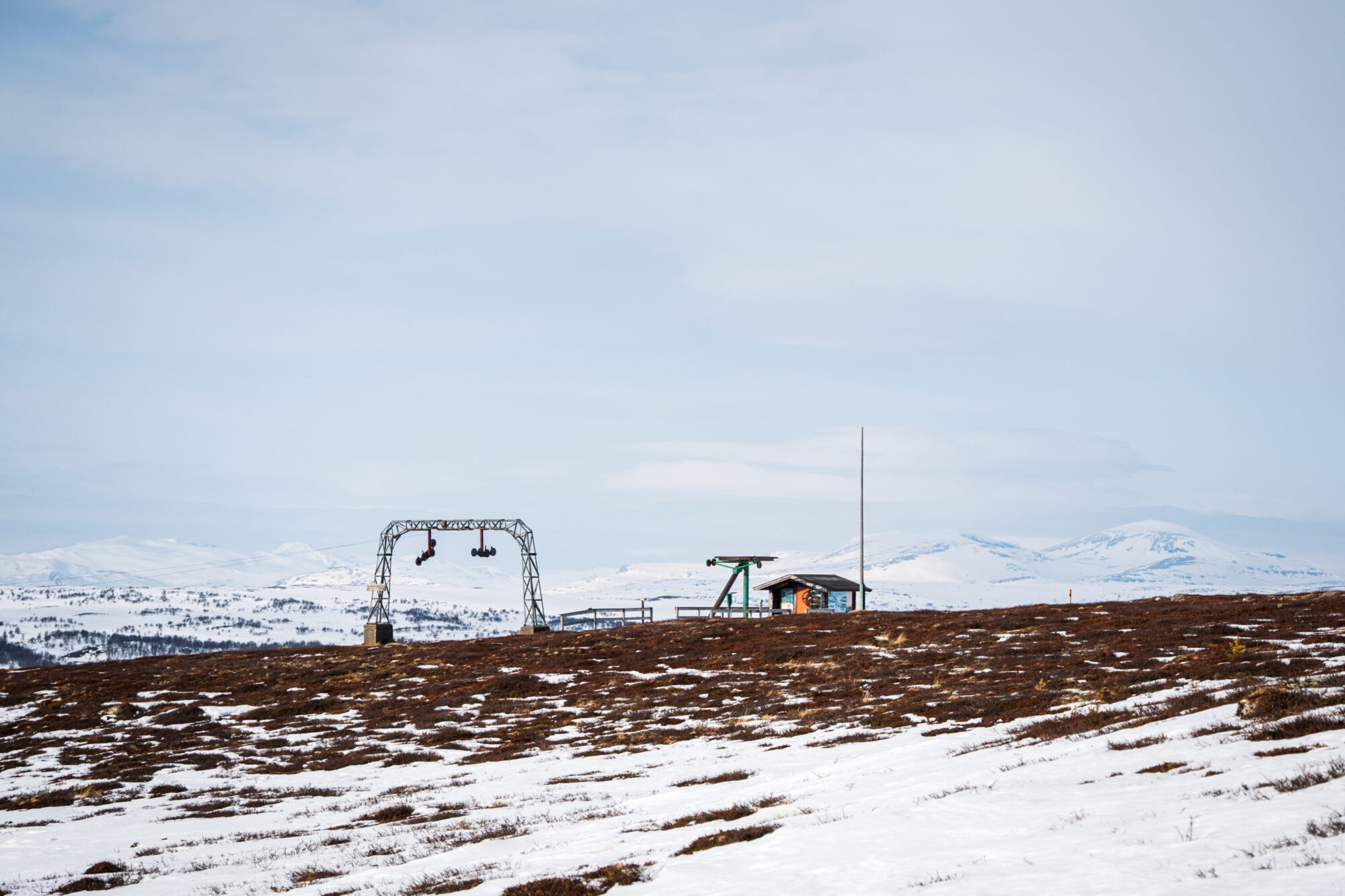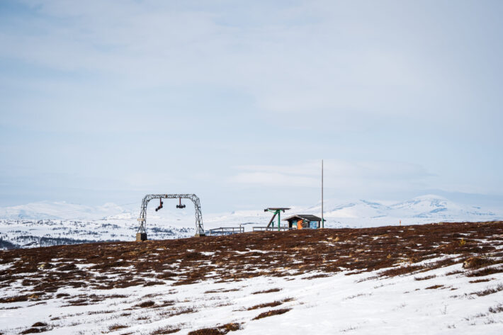 Uppskattningsvis så har vi gått i drygt en halvtimme när vi når kalfjället och ser det gamla lifthuset som också markerar slutdestinationen på Hamra Syd. Vi befinner oss just nu på knappt tusen meter över havet och härifrån ser vi flera vackra fjällformationer så som Skarsfjället, Helags och Skarvarna. Vi plockar av stighudarna och fyller på med lite energi innan det är dags att försätta pjäxorna i utförsläge och påbörja vägen ned.