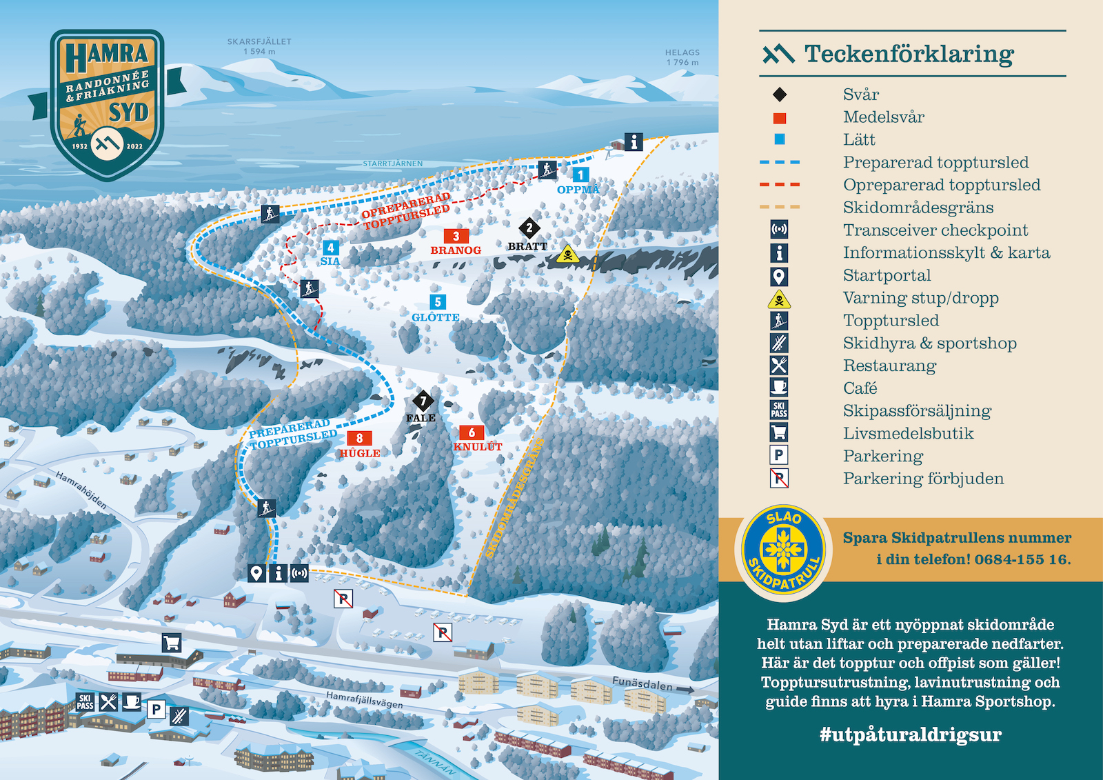 Skämt åsido, men faktum är att en del av den trygghet som kännetecknar området uteblir i takt med att skidanläggningen stänger. Eftersom Hamra Syd är en del av Tänndalens skidområde så är det också anläggningens ansvar att bekämpa eventuell lavinfara samt rycka ut om en skada skulle inträffa – det vill säga under områdets öppettider. Därefter är du utelämnad åt ditt eget öde (precis som på vilken annan topptur som helst)
