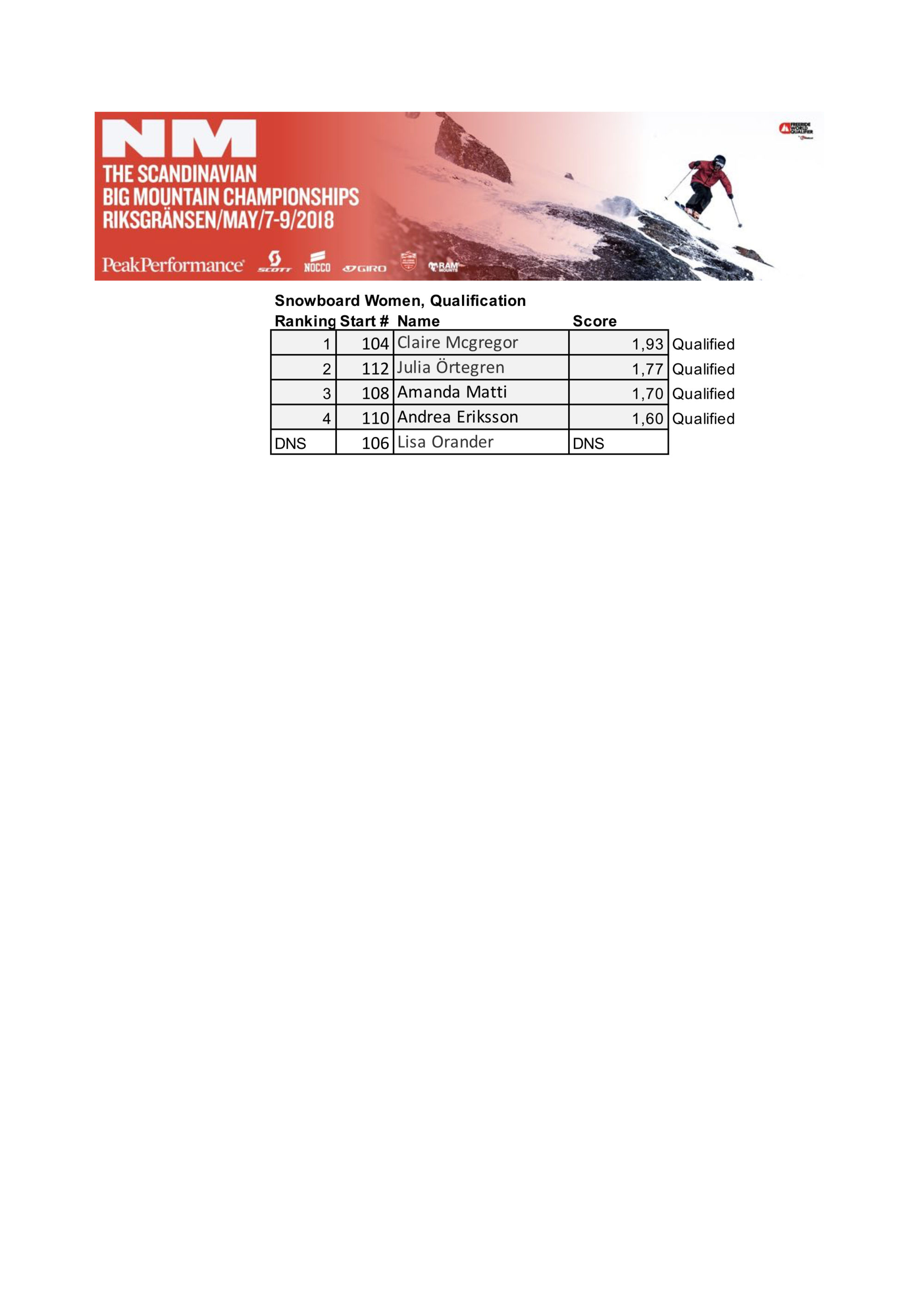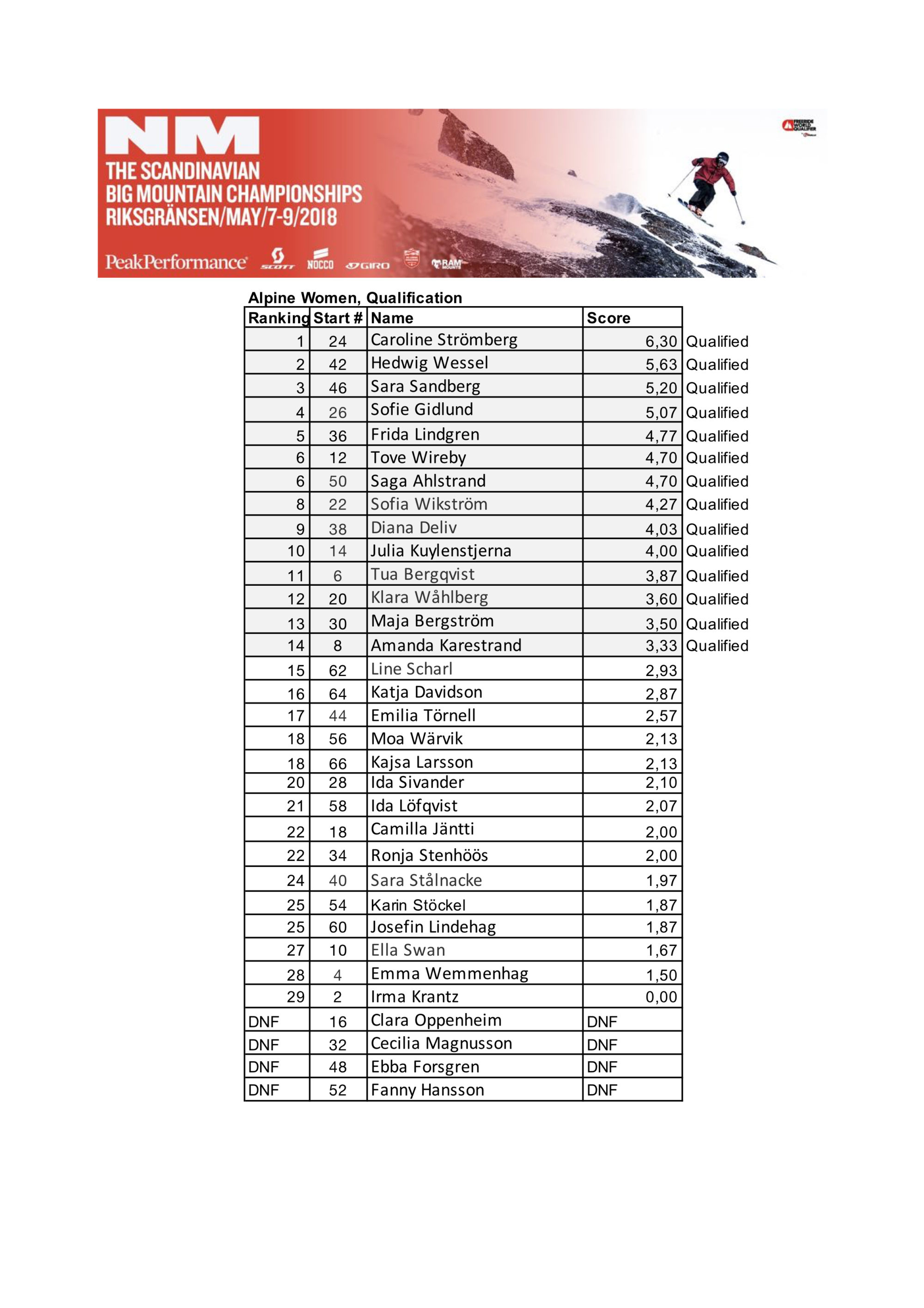 I damklassen på skidor startade kvaltours- och NM-rutinerade Caroline Strömberg som nummer 24. Caroline Strömberg åkte med hög fart och kontrollerade svängar över krönet efter det inledande lite mjukare partiet. I botten av sitt åk tog hon avhoppet Tungan utför Kvalklippan och säkrade sin plats i morgondagens final med bäst poäng av alla damer 6,30. Sofia Wikström, som när Freeride pratade med henne efter söndagens rekning sade att ”det känns inte så jättebra”, höll ihop sitt åk bra och svängde stabilt med lite udda dubbel stavisättnings-teknik och tog även ett fint drop och är vidare med 4,27 poäng.