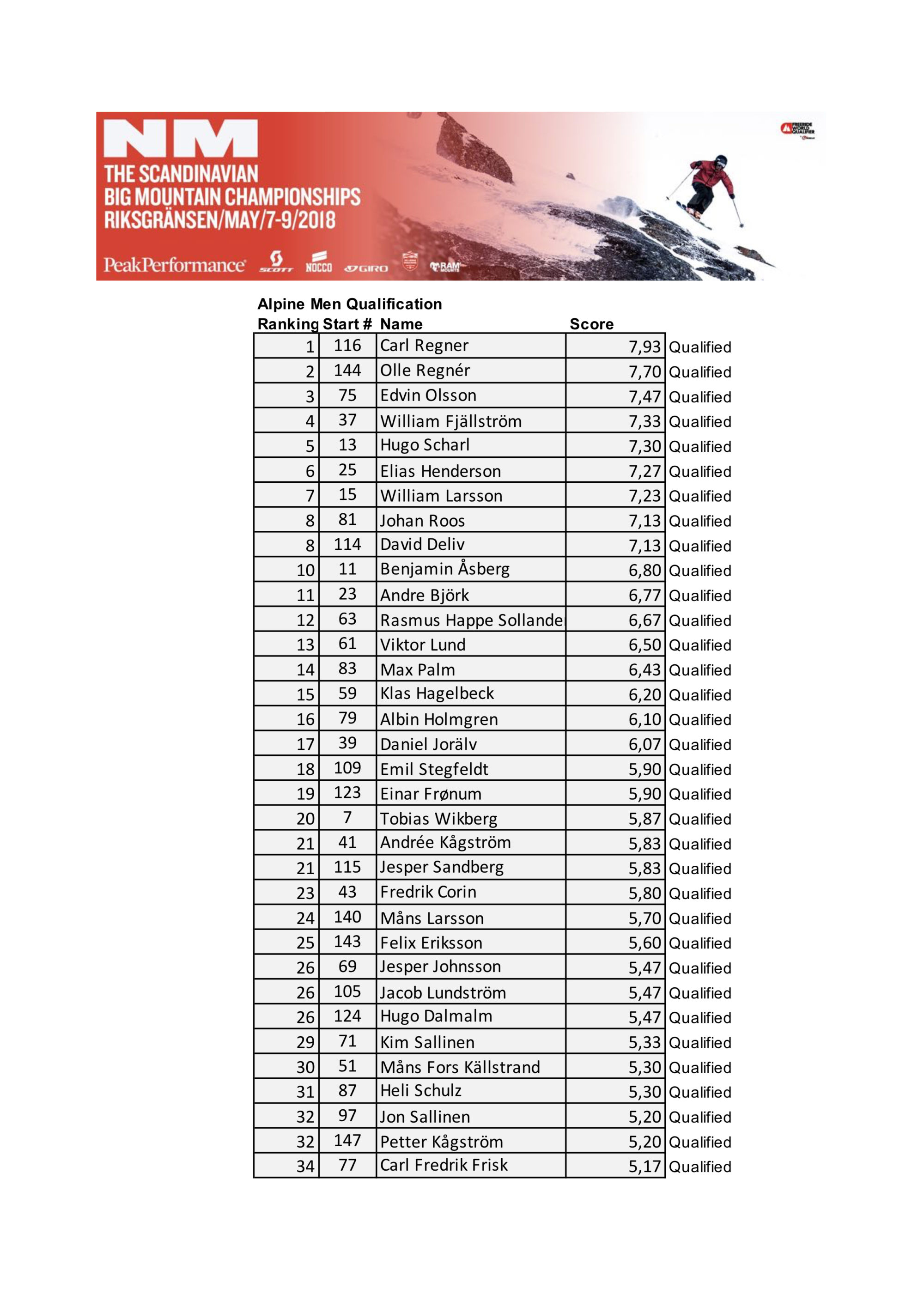 I herrklassen skidor var de största förhandsfavoriterna Reine Barkered och bröderna Olle och Carl Regnér. Först ut av dessa var Carl Regnér som inte har tävlat på hela vintern, eftersom han skadade handleden i inledningen på världstouren i Japan. Att den rödhåriga 25-åringen från Östersund inte tävlat sedan andraplatsen på NM förra vintern syntes inte alls. Han höjde nivån på årets tävling genom att inleda med en stor och kontrollerad backflip utför en av klipporna/vinddrivorna i övergången mellan den övre mjuka och flackare delen och den stenhårda branten nedanför. I branten gjorde Carl Regnér det som väldigt få andra åkare kunde göra idag – få skidåkningen i det svåra föret att se enkel och ren ut. Den yngre av Regnér-bröderna avslutade tillställningen med att ta Långflyget och sedan spätta ned mot mål i överljudsfart. Domarna gillade vad de såg och gav Carl 7,93 poäng och han går vidare som etta ur kvalet.