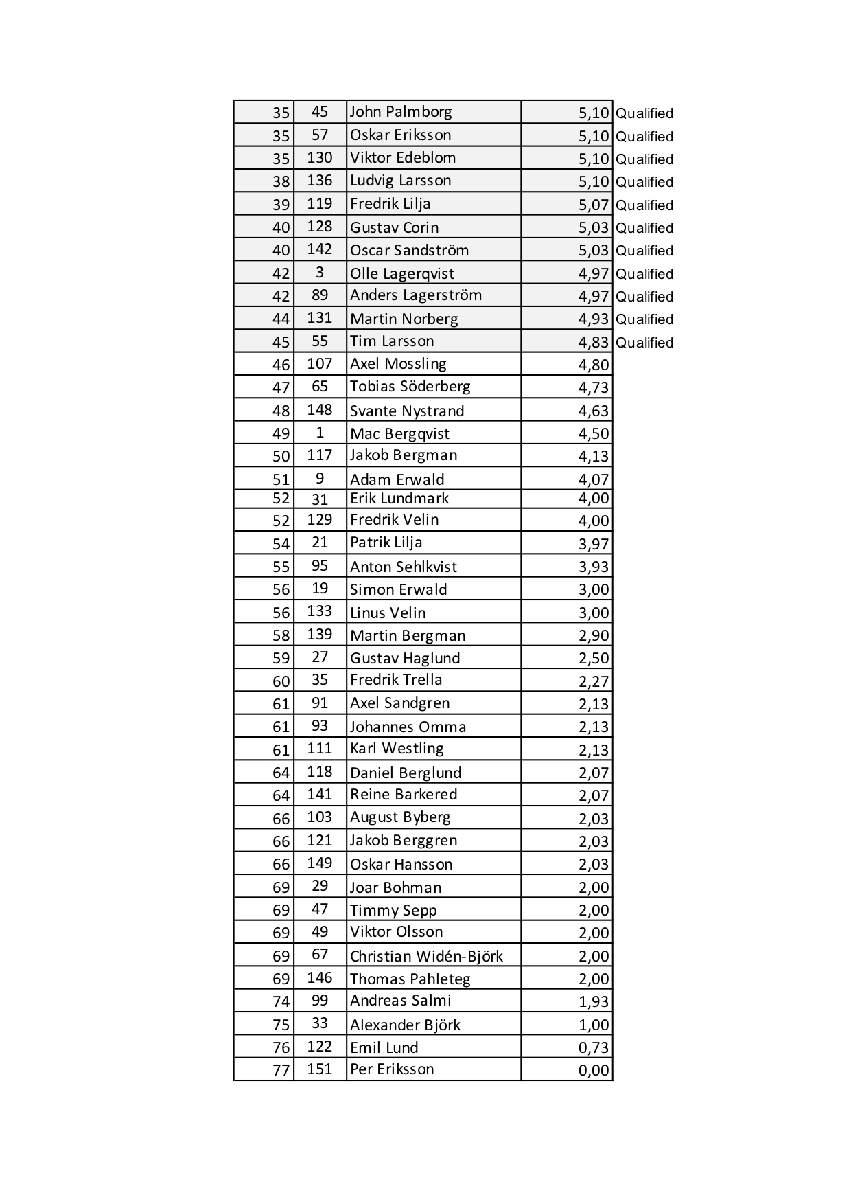 Olle Regnér som enligt speakern Felix ”Felkan” Lundin ”blir som en treåring när han förlorar” mådde påfallande dåligt före start. Som startande nummer 144 fick han vänta många, långa timmar efter morgonens rekning. Men Olle Regnér höll ihop det på bästa vis, med ett snabbt stabilt åk och en rejäl flygtur på Långflyget. Olle kom vidare med näst bäst poäng bland skidherrarna med sina 7,70. Just Långflyget blev som så många gånger förr i herrklassen skidor något av en nyckel idag. Andra som utmärkte sig i herrklassen med fina åk var både Elias Henderson och David Deliv som liksom Olle Regnér plockade Långflyget med kontroll och massa fart. Även William Fjällström, Edvin Olsson och William Larsson gjorde Långflyget. Hugo Scharl stack ut lite extra med sin stora 360 snett utför Långflyget.