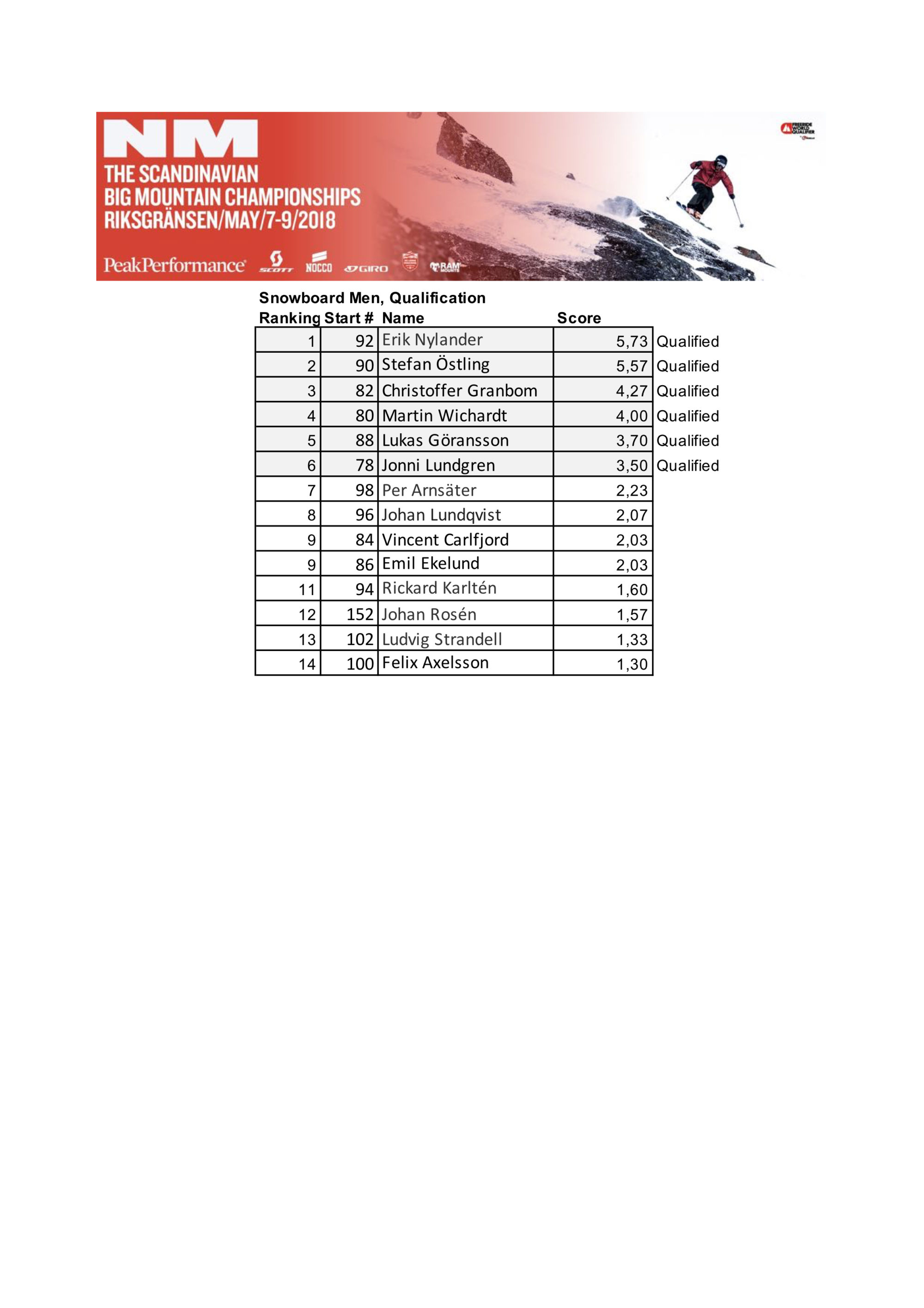 I brädklassen valde många att åka långt ut lookers left och hitta linjer bland stenskravel och klippor, en av dessa var 2016-års vinnare Stefan Östling. Stefan tog sig vidare till finalen som andreman. Erik Nylander valde istället att åka på motsatt sida av facet och avslutade sitt åk med ett fint drop utför kvalklippan vilket belönades med dagens högsta poäng 5,73 poäng på bräda. Med sig till finalen får de även Christoffer Granbom som kvalar in som trea.