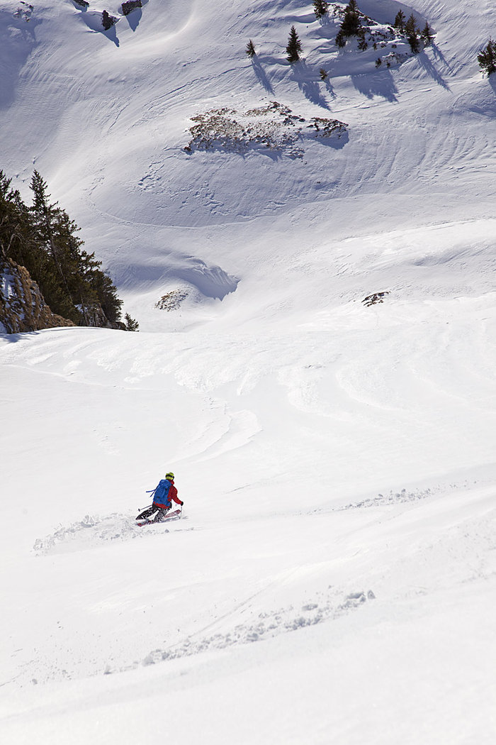 ![]() Åket nedför Salistock börjar med öppna vita snöfält där Oscar Hübinette lägger sina svängar…. |