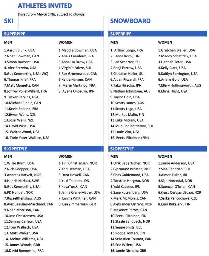 Henrik, som tog silver i grenen i X Games i Aspen nyligen, möter bland annat amerikanen Nick Goepper som tog hem slopestylen i X Games i Aspen och blev trea i Slopestyle-VM i Voss nyligen och britten James Woods, trea i Aspen och tvåa i VM. Läge för Harlaut-revansch nu efter missen i VM i Voss? Läge för ännu mer historieskrivande med nosebuttertrippeln från Aspen i färskt minne?
