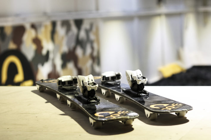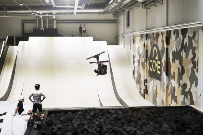 Vi beger oss in mot nästa hall, ”Jump and Pump”. Det är denna hall som gör Dome Adrenaline Zone unikt och extra lockande för oss skidåkare. Här får du åka på allt med hjul utan motor. Och vi kan lova att det kommer bubbla i varje adrenalinstinn kropp när ni stiger in i den här hallen. En gigantisk startramp med kickar och lutningar i olika svårighetsgrader väller upp på en av kortsidorna, landningen består av en gigantisk foampit samt en lutande Big Air Bag. Utöver detta finns en pumptrack, några hopp och en tre meter hög upphöjning ovanför den andra sidan av foampiten där du kan droppa ner. Vi tar på oss pjäxorna för att testa rampen med skidor på fötterna.