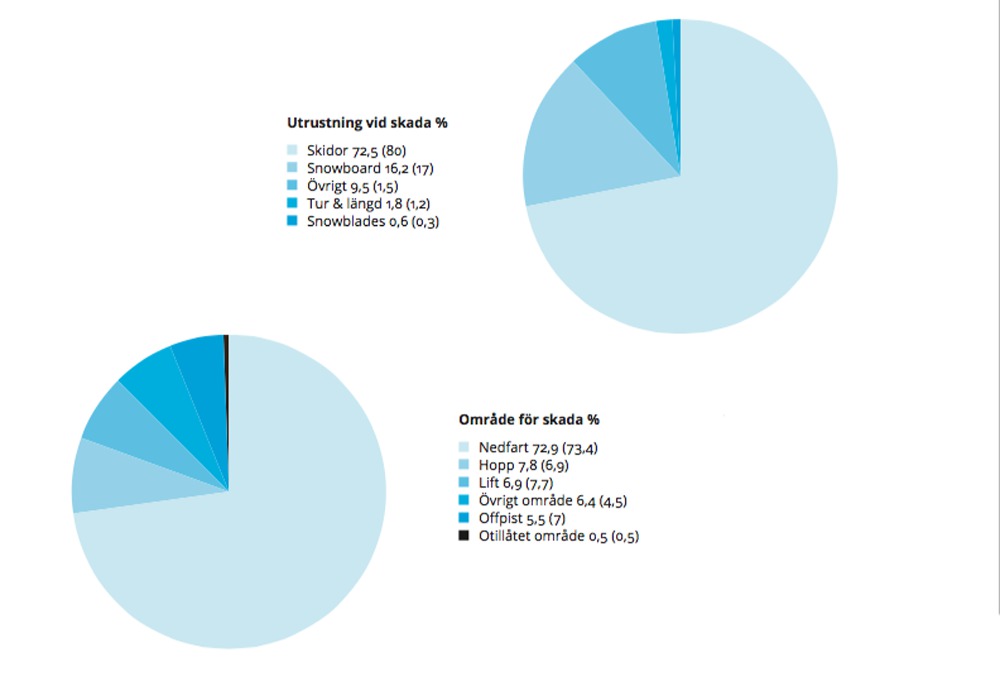 SLAO (Sveriges Liftanläggningars Organisation)har sammanställt statistik från föregående års säsong över skador. Informationen är inhämtad från 10 fjällanläggningar där 3 979 000 skiddagar registrerats och 3 551 personer omhändertagits. Dessa anläggningar står för 83 procent av den totala statistiken.