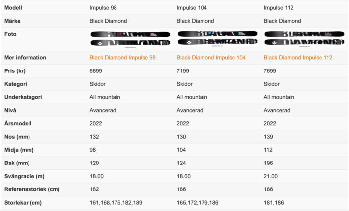 Medan Black Diamond Impulse 98 är snabb från kant till kant och är den mest lekfulla av alla, så är Impulse 112 trygg och går som ett lok. Med små justeringar får du dock 112 att ändra kurs och du kan ligga i carvingsväng även i hårdpackat trots den breda midjan. Impulse 104 är den som är mest allround, med relativt kort svängradie, 18 meter på 186 cm långa skidor, är det dukat för storslalom-svängar i isiga svenska pister.