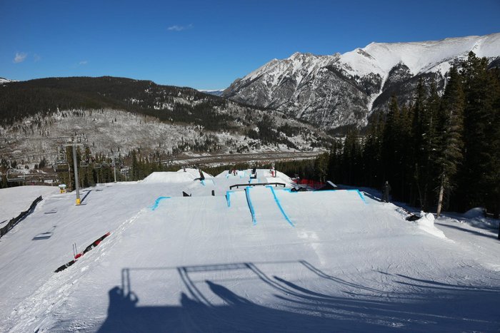 Vy över en del av slopestylebanan i Copper Mountain.