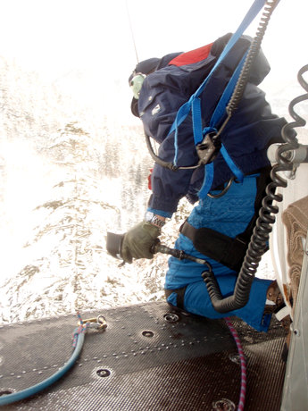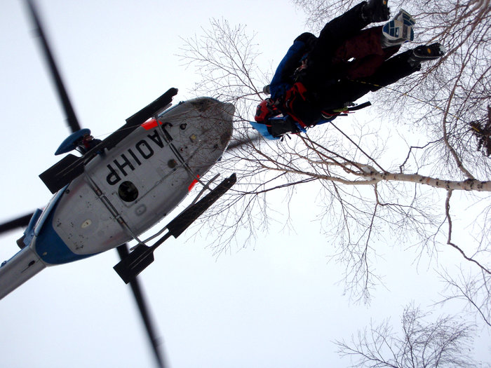 Lite sömn, några ägg och bacon och sen är man igång. På med utrustning och sedan upp till gondolstationen där tre TV-bilar stod parkerade över natten. Klockan blir fem och räddningsinsatsen sätts igång. 30 skidåkande poliser samt 30 militärer fotograferas av press och sig själva innan de tar farväl av dalstationen för att åka upp på berget med uppgiften att rädda utlänningarna. Japanerna älskar att vara hjältar och dom ser till att göra hela räddningsinsatsen till ett jättestort PR-jippo. Väl uppe vid toppen av sittliften med skins på får vi av gruppchefen reda på att de har börjat lyfta upp dom strandande snöentusiasterna med helikopter.