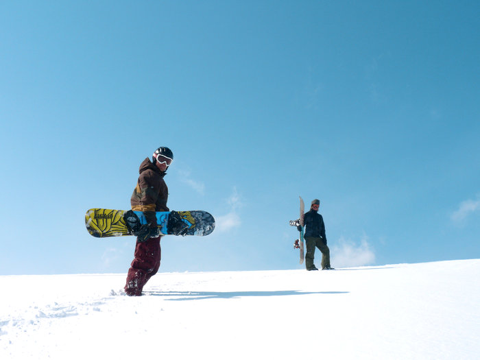 Efter 1,5 timmes hajkande är det kort rast, solen har nu gömt sig bakom moln och vinden blir starkare. 30 minuter från toppen tappar en snowboardåkare greppet och rullar sakta nerför berget. Han anmäler ett starkt intresse att offpiståket ska starta härifrån istället för från bergets topp. Han får med sig fem andra personer som efter fem minuters genomgång med Andrew om vägen ner, försvinner nerför berget. Direktiven var: “Åk ner i ravinen till trädlinjen då ni skråar vänster ner till liften”. 30 minuter senare är jag, Bevan och Andrew på toppen. ”Skins off” och sen piper vi ner i mittenbowlen i tung dimma.