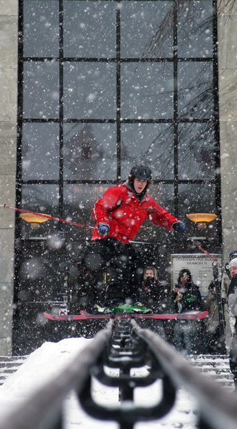 Efter någon timmes hoppande övergick man till lite railande, det nu mer kända Stadsbiblioteksrailet som Jacob Wester förevigade i den senaste Free Radicalsfilmen för att vara lite mer precis. En kick byggdes och ansatsen började i princip inne i biblioteksentrén. Med lite starthjälp lyckades åkarna precis få den fart som krävdes för att komma upp på railet. Men det skulle visa sig svårt att upprepa Westers prestation. Railet var inte bara långt utan även högt, något som Gustav fick erfara när han satte en skida på vardera sida om räcket…