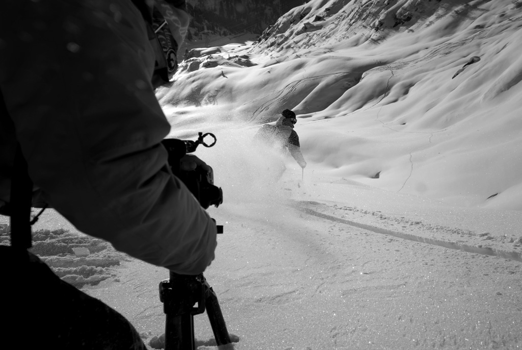 På andra sidan vägen i St Christoph är snön orörd. Johan Rosengren filmar Mårten Bergkvist i några svängar.
