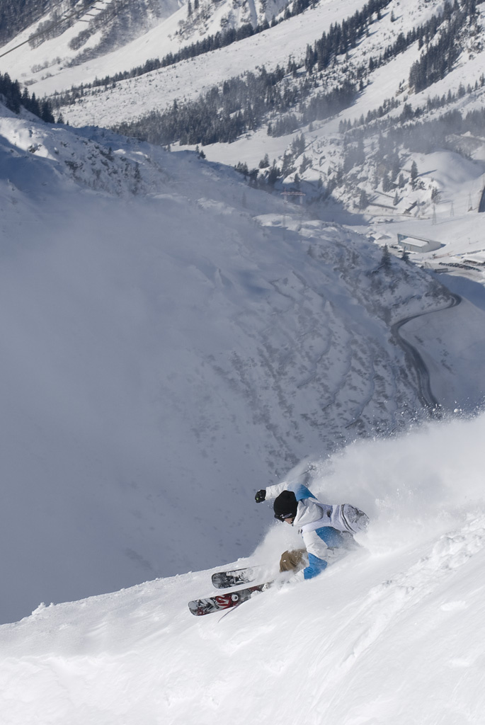 Fortfarande ligger molnen täta ovanför oss. De omsluter bergen och gör det svårt att avgöra om det ska bli bra väder. Men molnen ligger lågt och samtidigt som solen lyser ovanifrån kommer de sakta att försvinna fram mot förmiddagen. Vi glider igenom molnpartiet och upp på Galzig-toppen 2185 meter över havet, där är det klar blå himmel. Ett bergslandskap med orörda snöfält sträcker sig i alla vädersträck runt omkring oss. Vi väljer att hålla till på St Christoph-sidan där solen ligger på hela dagen och ger bra möjligheter till bilder och film.