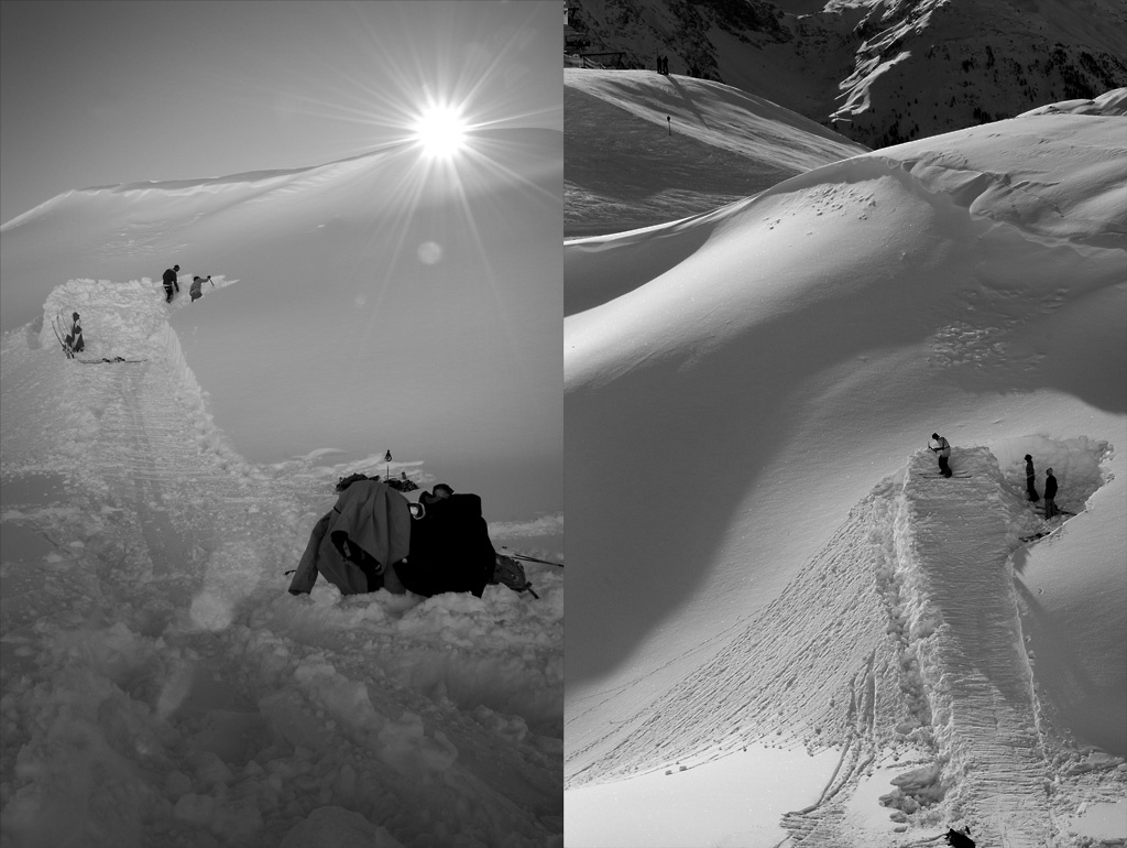 En vecka har nu gått sedan Mårten och jag anlände till St Anton. Större delen av tiden har det snöat och varit grått. Men äntligen ser det ljusare ut. Fyra dagar sol ligger framför oss. Vi är tidigt uppe i systemet denna söndagsmorgon. Vi tar sikte mot toppen, Vallugagrat 2650 möh. Johan passar på att filma porträtt samtidigt som Lars hittar dagens uppgift, ett step up. Nedanför den avsats vi står på, där Vallugal liften tagit oss till toppen, ligger en gryta med en driva som ligger helt perfekt för att ett step up ska fungera som ramp och låta åkarna flyga upp på toppen av drivan. Vi börjar bygga och märker snabbt att detta kommer bli riktigt bra. Farten är inget problem. Den branta bergssidan upp mot Vallugagrat är både brant och lång. Ett rop kommer från ingenstans. Uppe på drivan står en gulklädd österrikare och skriker. En snabb titt på klockan och vi fattar direkt att det är dags att bege sig hem. Liftarna stänger om tio minuter och snart är pisterna belägrade med pistmaskiner.