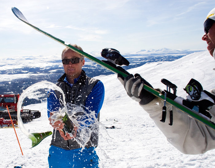 Helikopterpiloten Lars var nöjd med sin dag på jobbet och firade med champagne.
