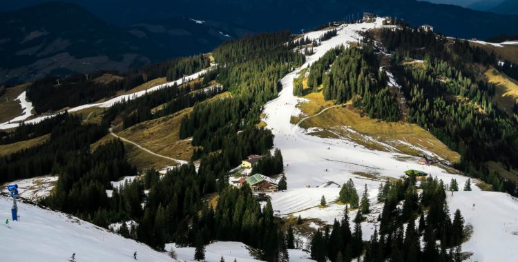Väl uppe på toppen, denna dag i det enorma systemet som Kitzbühel normalt har att erbjuda, var åtminstone utsikten inte fullt så deprimerande. De flesta topparna i fjärran ser i alla fall någorlunda snötäckta ut och förvånansvärt många liftar och backar är öppna och faktiskt i riktigt bra skick.