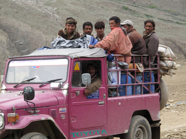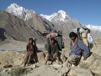 För att transportera all vår utrustning och mat för sex veckor upp till K2 fick vi hyra in bärare. Bönderna i Askole är alltid sugna på ett extraknäck och ställde gärna upp. De blev så glada att de nästan började slåss om grejorna. Efter lite kaos hade vi fördelat ut 40 stycken 25 kilos lass till bärarna och vi var på väg.