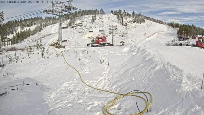 Snön har fått sussa under en fiberduk i väntan på säsongspremiär, och därefter har den schaktats ut i backen. Massorna räckte till en 50 meter bred backe som har ett snödjup på en meter och är drygt 1,5 km lång. Inte så pjåkigt för att vara i mitten på oktober, och igår snurrade liften igång och säsongens första skidsvängar kunde avnjutas i Kåbdalis. Premiärdagen lockade ungefär 100 skidåkare, vilket var lägre än förväntat och förklaras av att utannonserade premiär faktiskt redan var på lördagen men denna fick skjutas fram på grund av att en vinsch gick sönder.