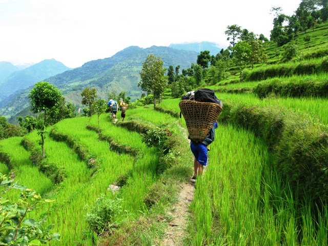 Resan fortsatte med en timmes flygresa österut till Bhadrapur och vidare med jeep via Ilam till Gopetar. Efter en dags väntan på en väska som försvann på flyget till Bhadrapur började vi i fredags vandringen upp mot Kangchenjunga basläger. Vi är nu halvvägs på den åtta dagar långa turen och det inte är inte den helt vanliga vandringen som vi är vana vid. Vi har vandrat längs med ris- och majsfält, korsat älvar på hängbroar av trä, druckit te från de lokala teodlingarna, ätit bananer som vi plockat från bananträd längs med stigen. Delar av vandringen går genom djungelliknande skog . Det är varmt och fuktigt, stenarna är hala och blodiglar anfaller från alla håll. Jag och Jörgen har enats om att djungeln inte är vårat favorit ställe.