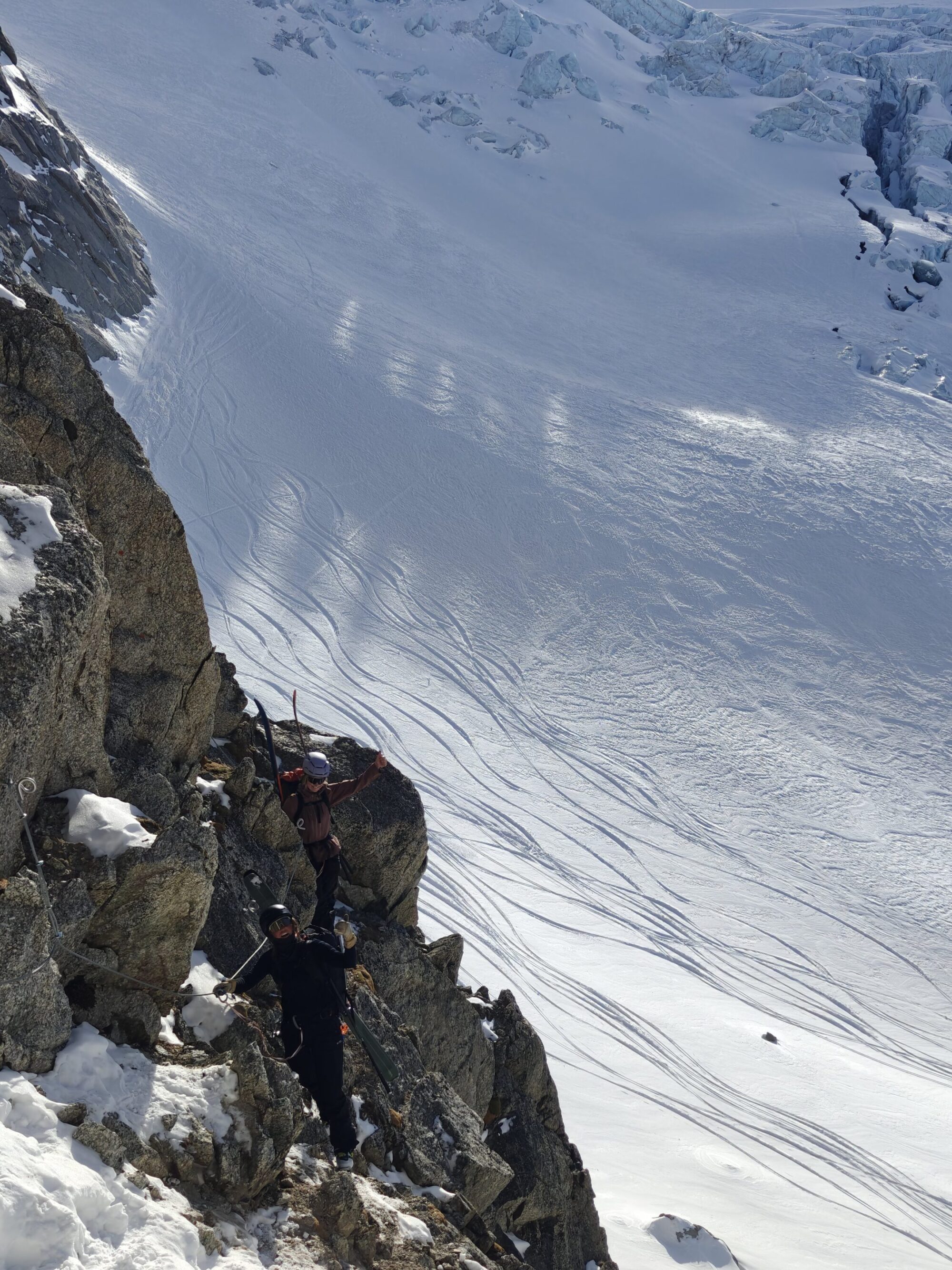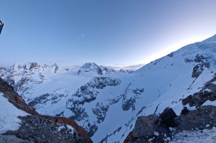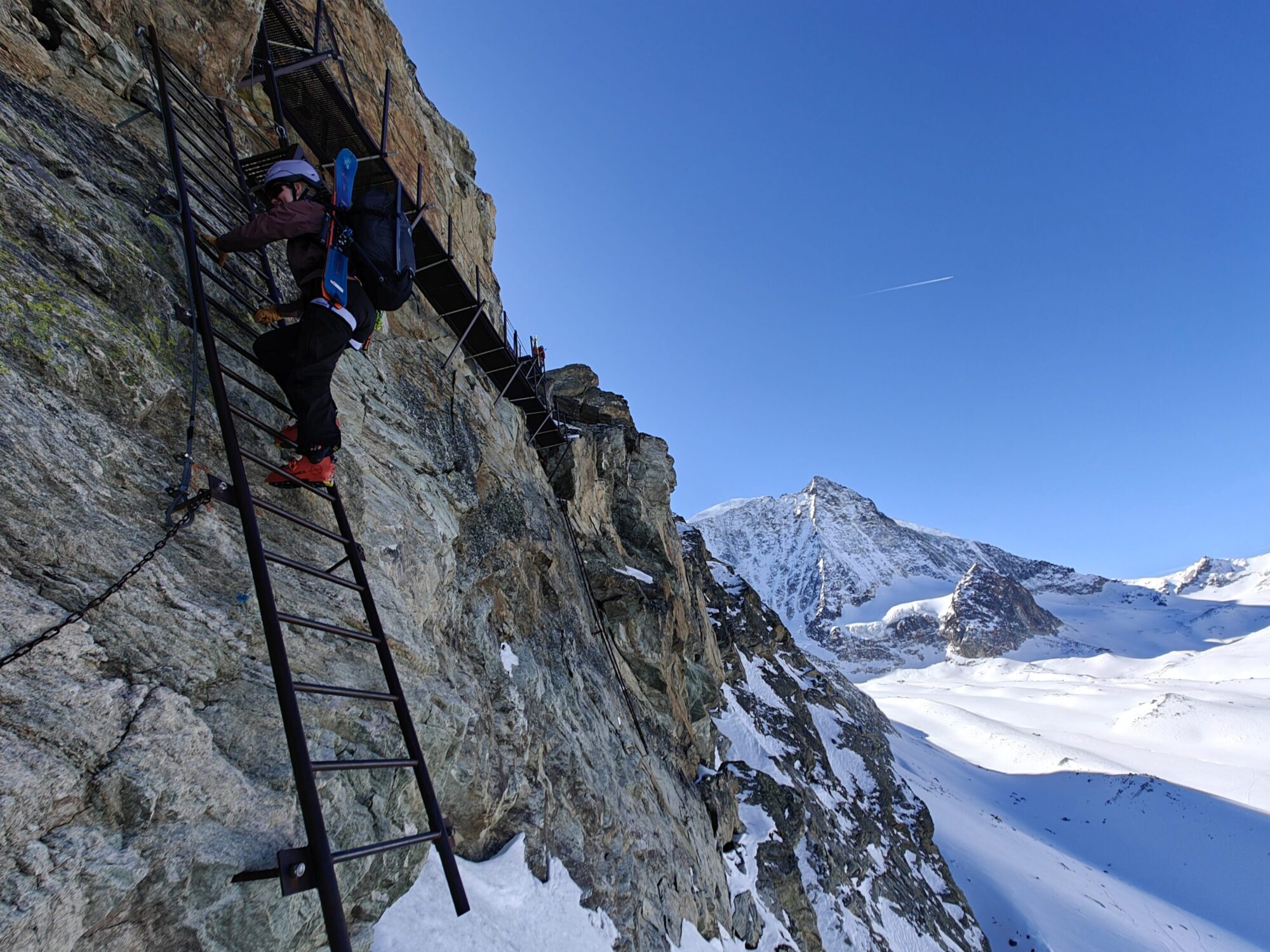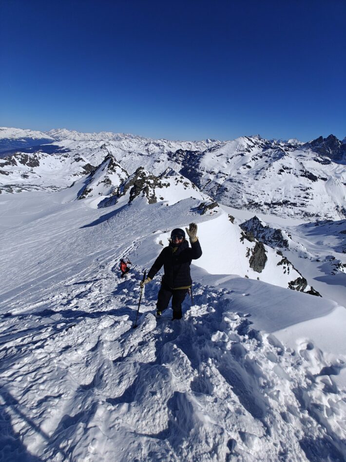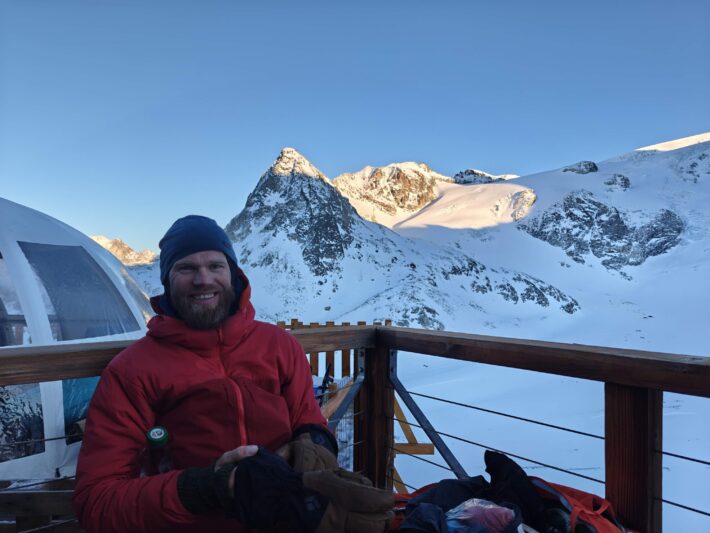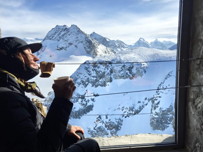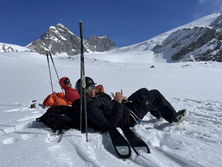 Vi vaknar med planen om att vi ska gå upp på Pigne de Arolla. Men vädret ville något annat. Stark vind och snödrev över ryggen på dagens topp fick oss att tänka om. Från Cabane des Dix valde vi istället skida ner mot via ferratan upp till Pas de Chéveres. Här fick vi internet och service på telefon, perfekt för uppdatering av väder, snö och annat.