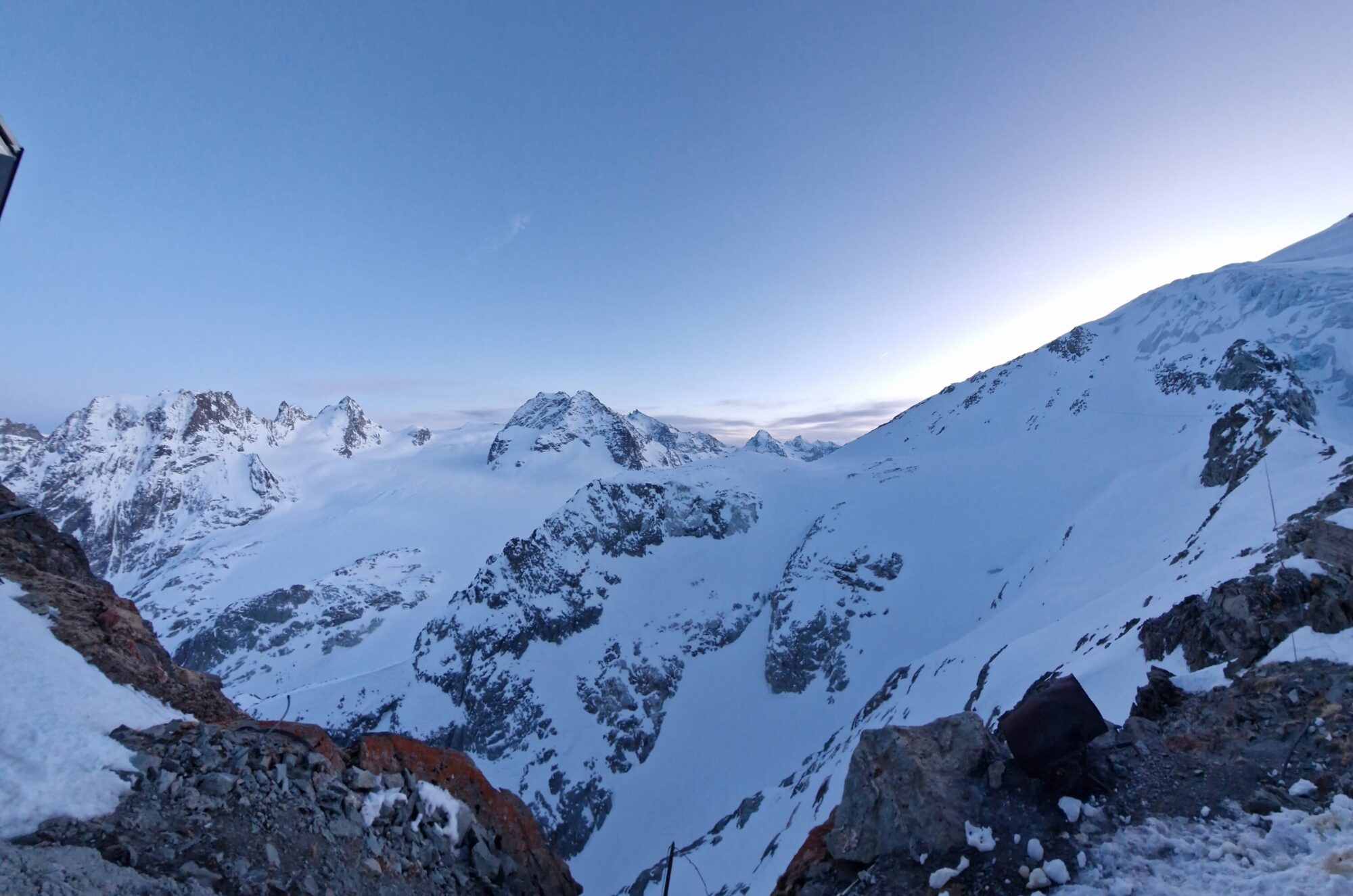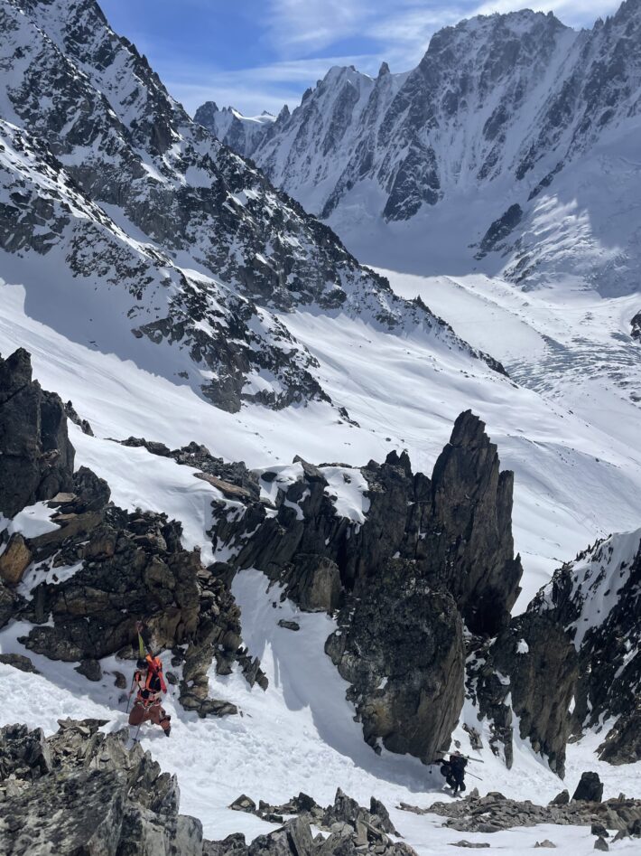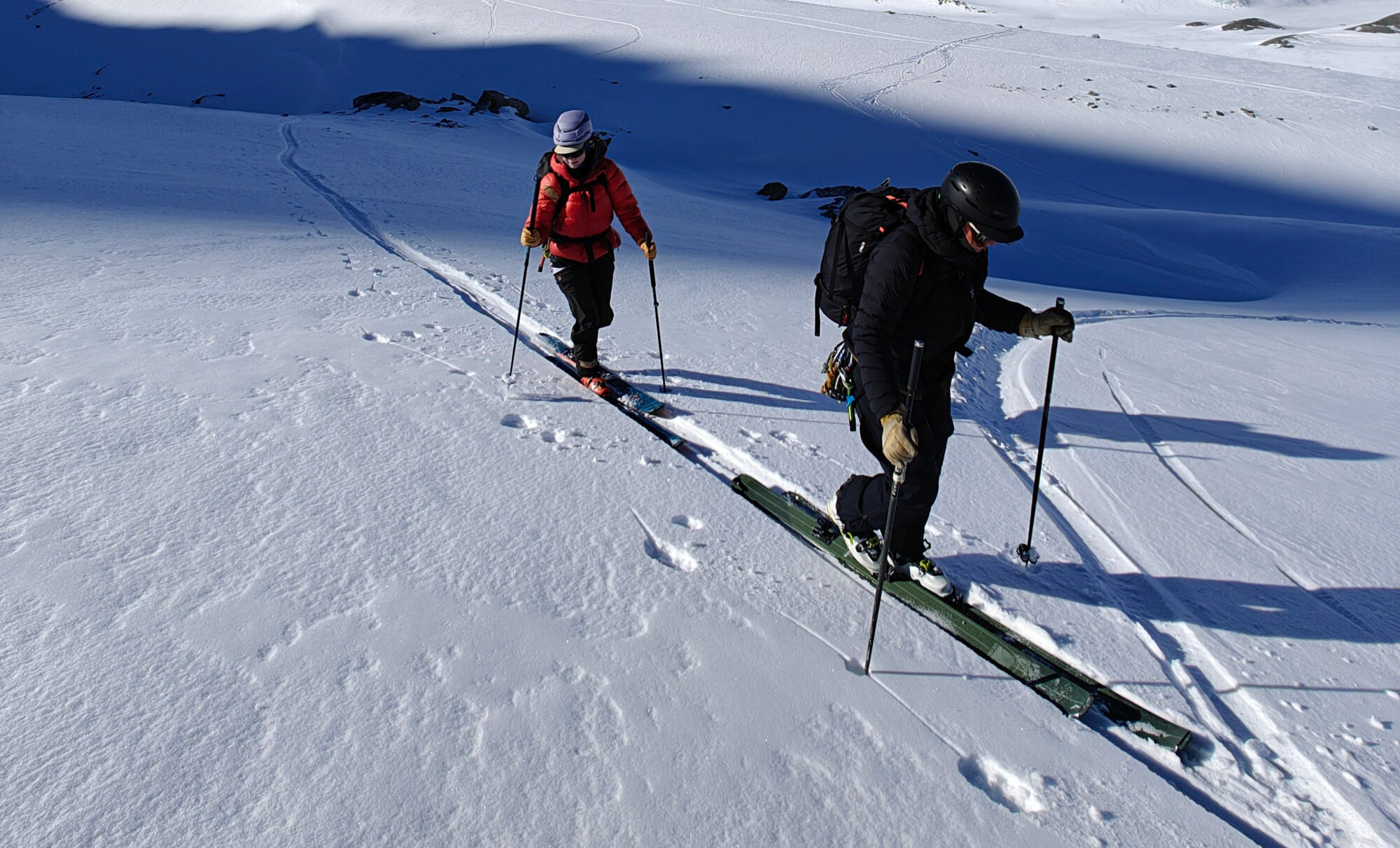 Härifrån gick vi på hudar upp mot Col du Mont Brulè. Här var det booting i stark vind och över krönet väntade en till oas. Utsikt över Haut Glacier de Tsa de Tsan. Vart vi skidade ner för att ta resans längsta förmiddagspaus innan sista uppförsbacken mot Col de Valpelline. Här uppe väntade 1 900 fallhöjdsmeter ner till Zermatt.