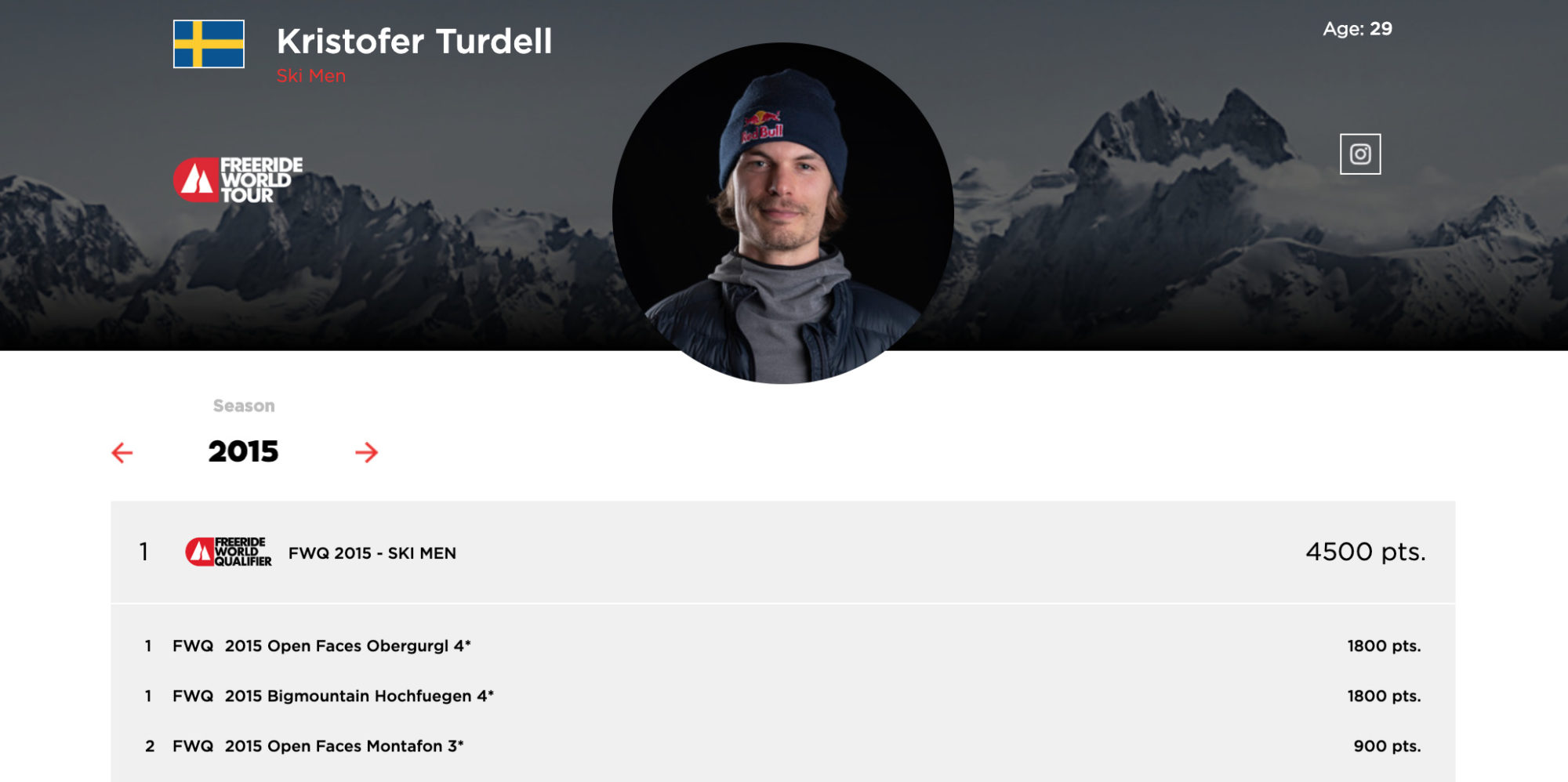 ANTAL SÄSONGER PÅ FWT: 4. Debuten 2016 blev han 4:a, 2017 tog han brons, 2018 guld och nu senast 2019 kom han 2:a.