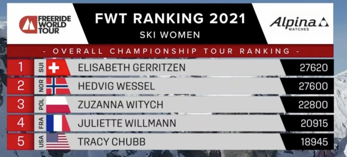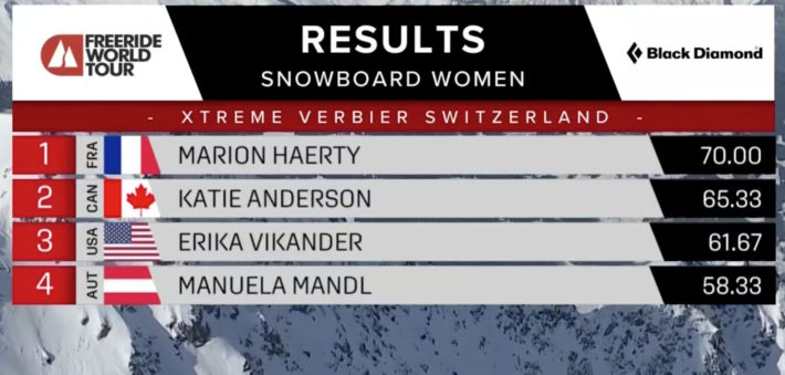 Med ett stabilt åk vann hon sin fjärde raka tävling denna vinter och därmed även totalen. Marion Haerty har nu vunnit Freeride World Tour tre år på raken och totalt klivit upp som världsmästare i friåkning, bräda hela 4 gånger.
