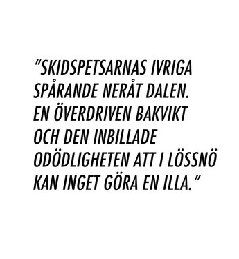 Om det inte spelar någon roll hur mycket erfarenhet rikare man blir, om känslan i magen består – hur mycket åldras man egentligen då? Om känslan från de uppspårade rodelbanorna i Sälen, från parken i Bräcke, till baksidan av ett alldeles för stort berg där vägen ner ter sig en smula osäker – är densamma? Om trots att utrustningen, kläderna, ryggsäcken, vätskan i glaset, skidorna under fötterna och allt det andra skiljer sig, men känslan är densamma, vad har då egentligen hänt? Det är ju fortfarande jag mot mig själv.