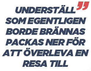 Väskan plockas upp från marken, där den placerats ömt, efter att de sympatiska och tålmodiga chaufförerna varsamt och långsamt tagit fram den ur bussen. Har du ett kombinerat skidfodral och klädesfodral, kan det vara bra att le åt de roliga kommenterar som chaufförerna genererar mellan sina blekfeta andetag. Hävda att du har valfri borgerlig politiker i väskan så blir alla sådär muntra så man undrar om man inte hamnat i en Stefan&Krister–fars.