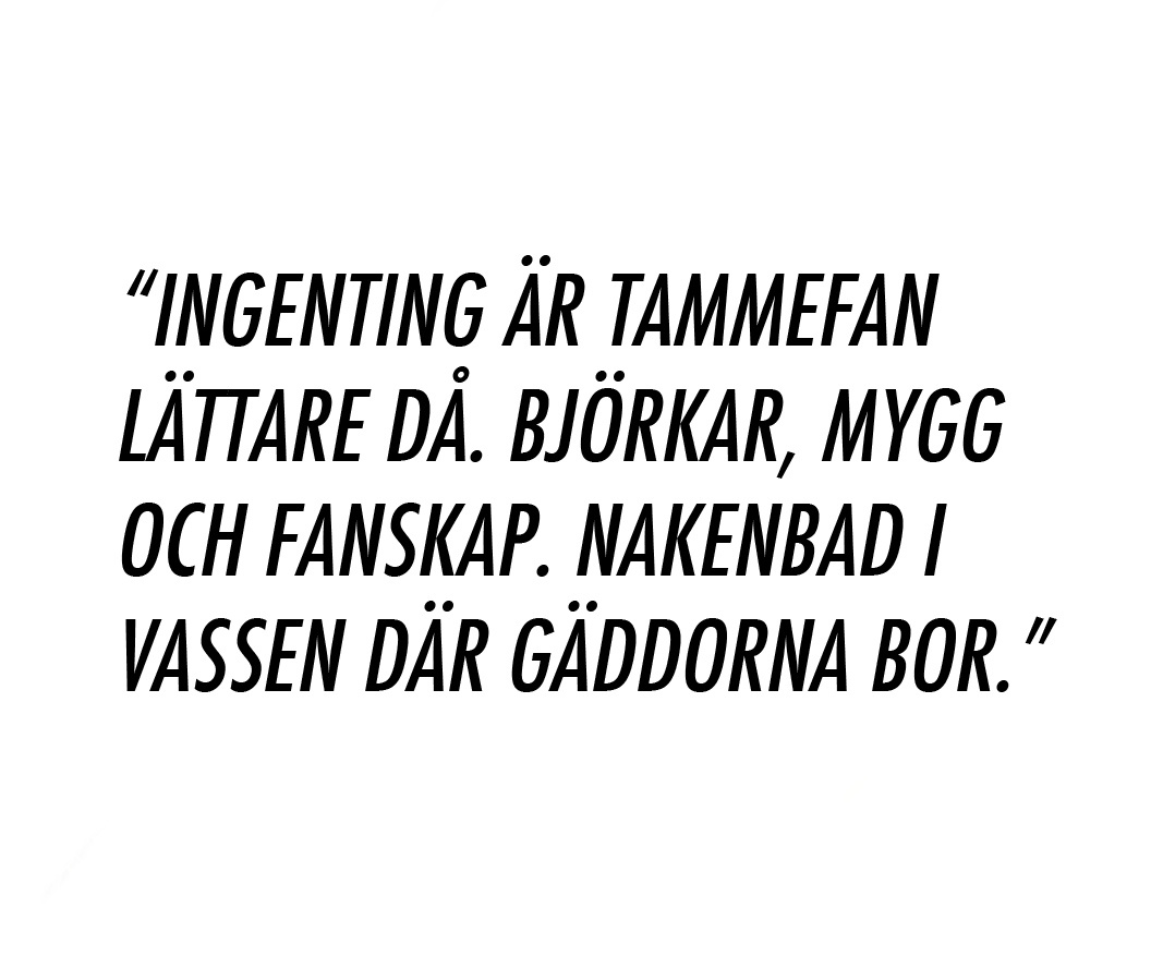 Om ni inte förstått det än så lider jag lite i maj, juni och möjligen början juli. Ingenting är tammefan lättare då. Björkar, mygg och fanskap. Nakenbad i vassen där gäddorna bor.