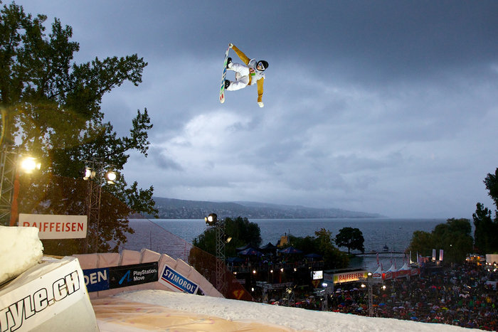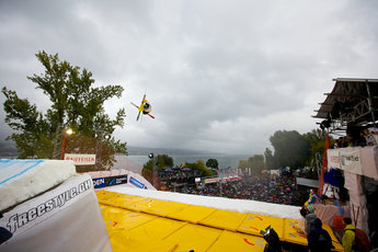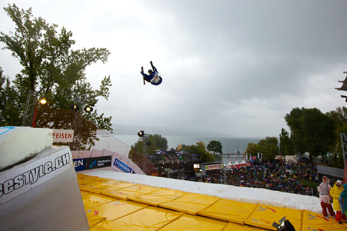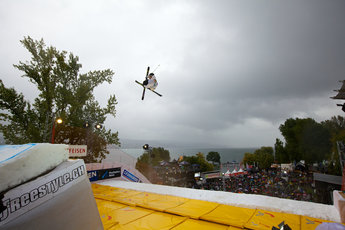 Action från gårdagens regniga kval under Freestyle.ch där Henrik Harlaut placerade sig i topp i skidklassen och finländaren Peetu Piiroinen i snowboardklassen.