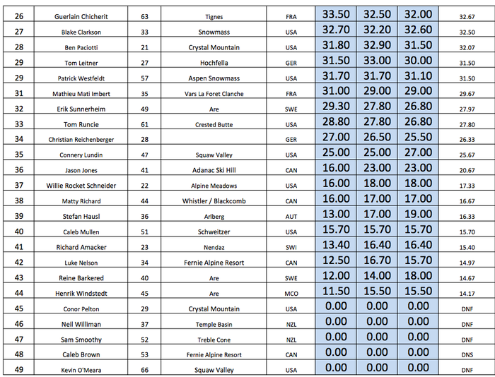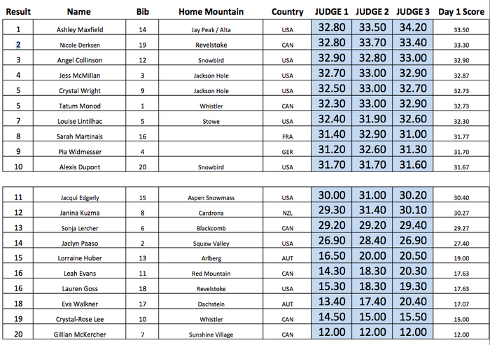 I ledningen efter första dagen finns 21-årige Kye Petersen från Whistler. Kye som tidigare mest fokuserat på film, är storfavorit inför söndagens final med amerikanarna Drew Tabke och Oakley White-Allen närmast bakom sig. Främste åkare från Freeride World Tour, Samuel Anthamatten, hittas först på 15:e-plats.