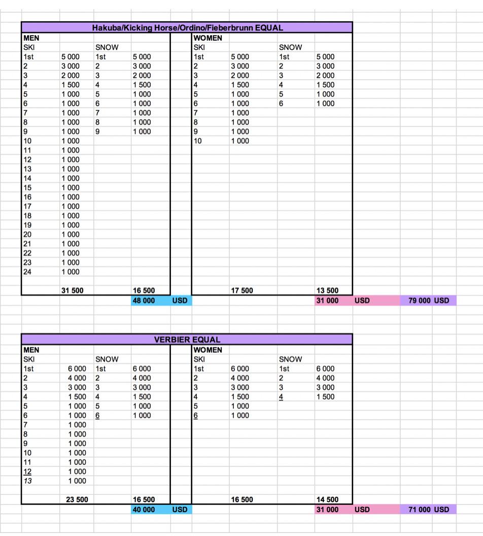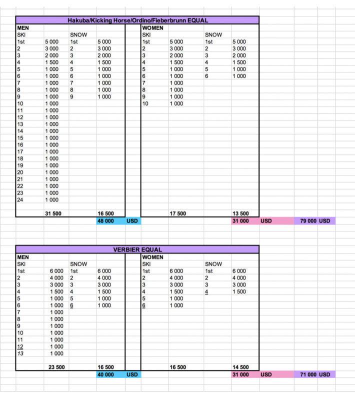 Vinner du snowboard eller skidor som man eller kvinna på någon av de fyra första tävlingarna på Freeride World tour 2020 så får du en prischeck på 5000 USD, en andraplats ger 3000 USD och en bronsplats ger 2000 USD. På finalen i Verbier är alltid lite större, så även prispengarna och där är det +1000 USD på samtliga podiumplaceringar.